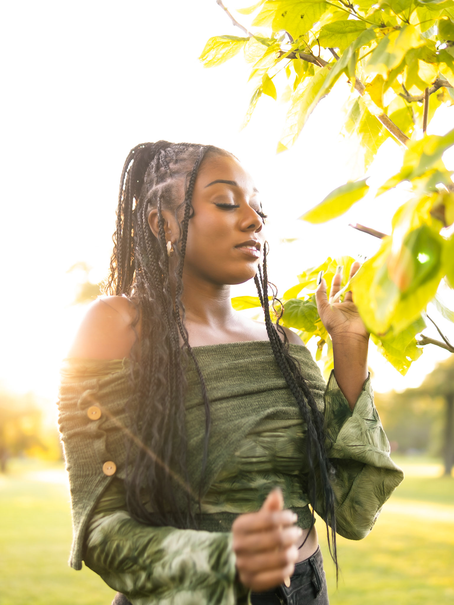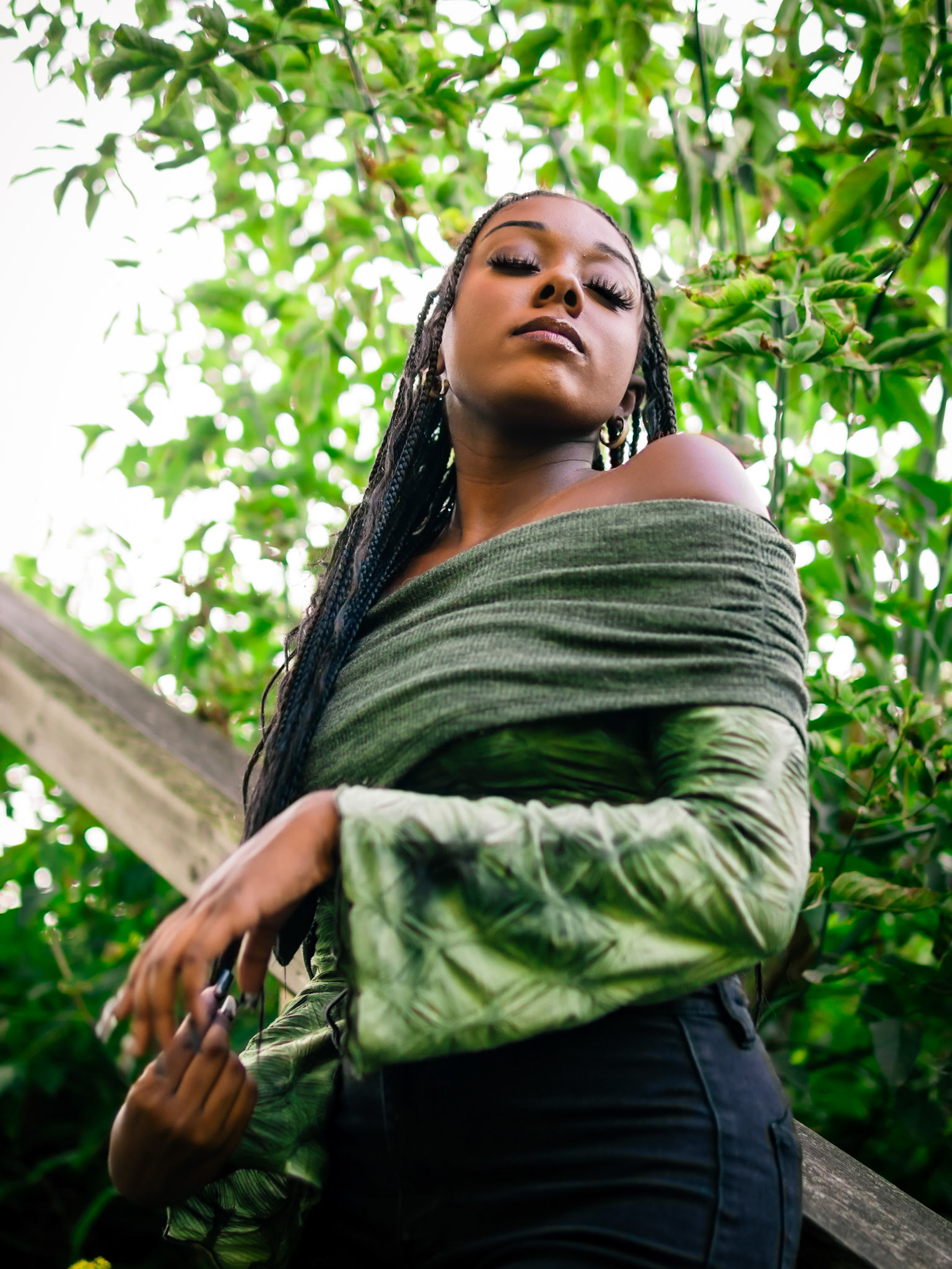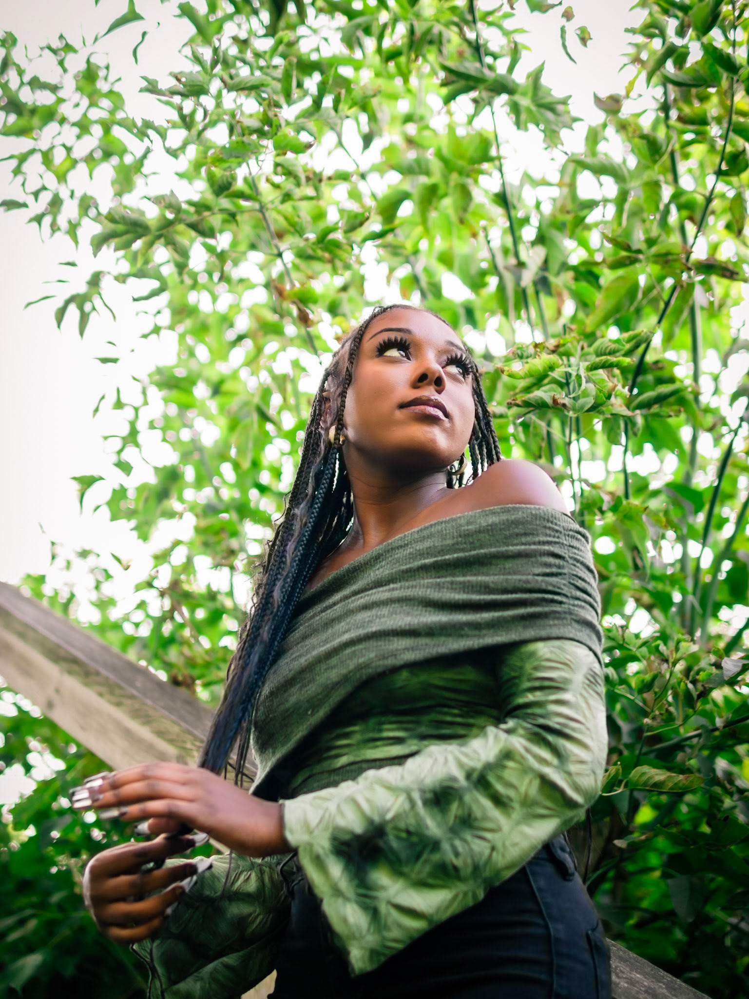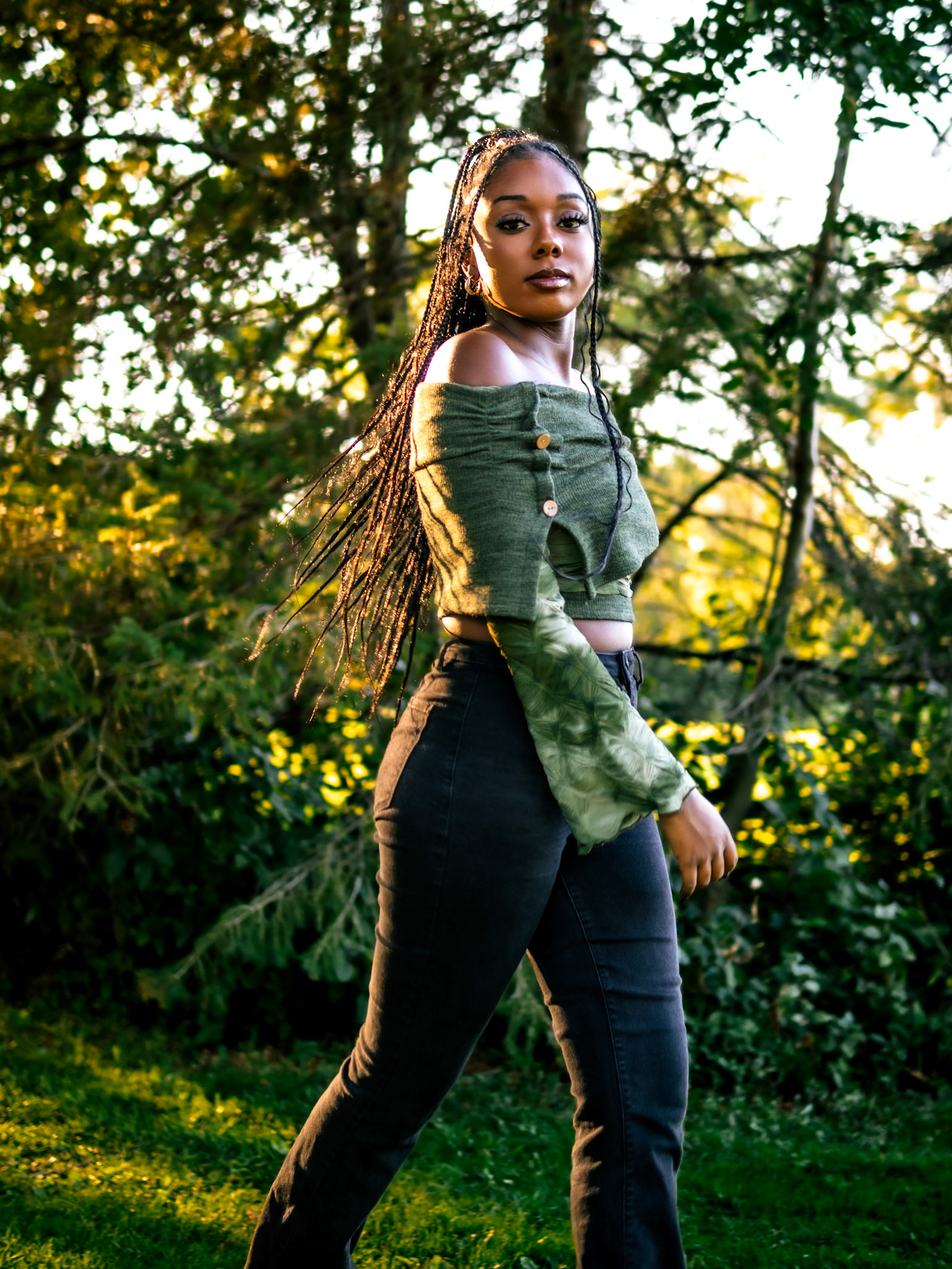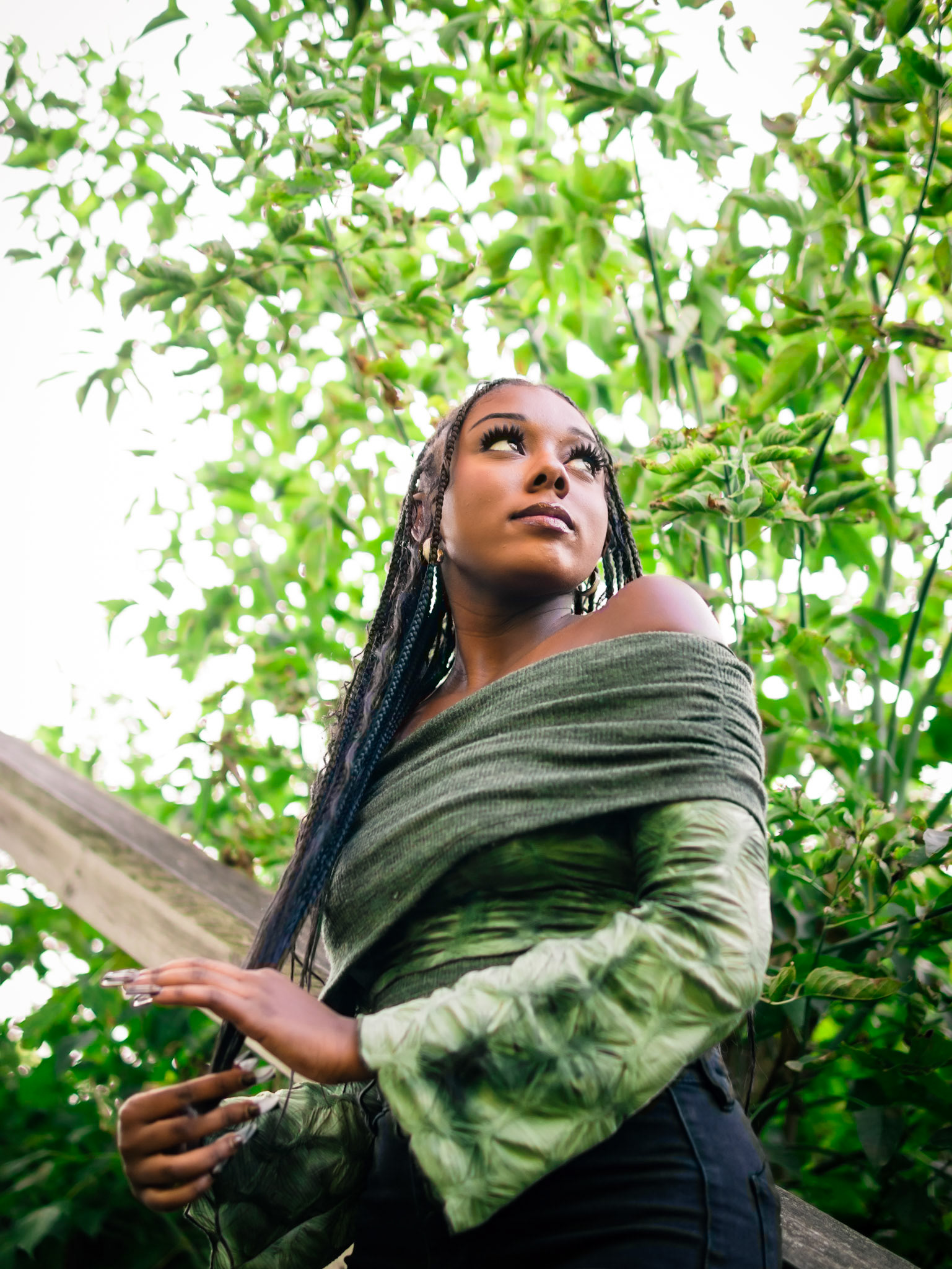 A refreshing nature photoshoot, perfectly blending a vibrant green-themed outfit with the beauty of the outdoors.