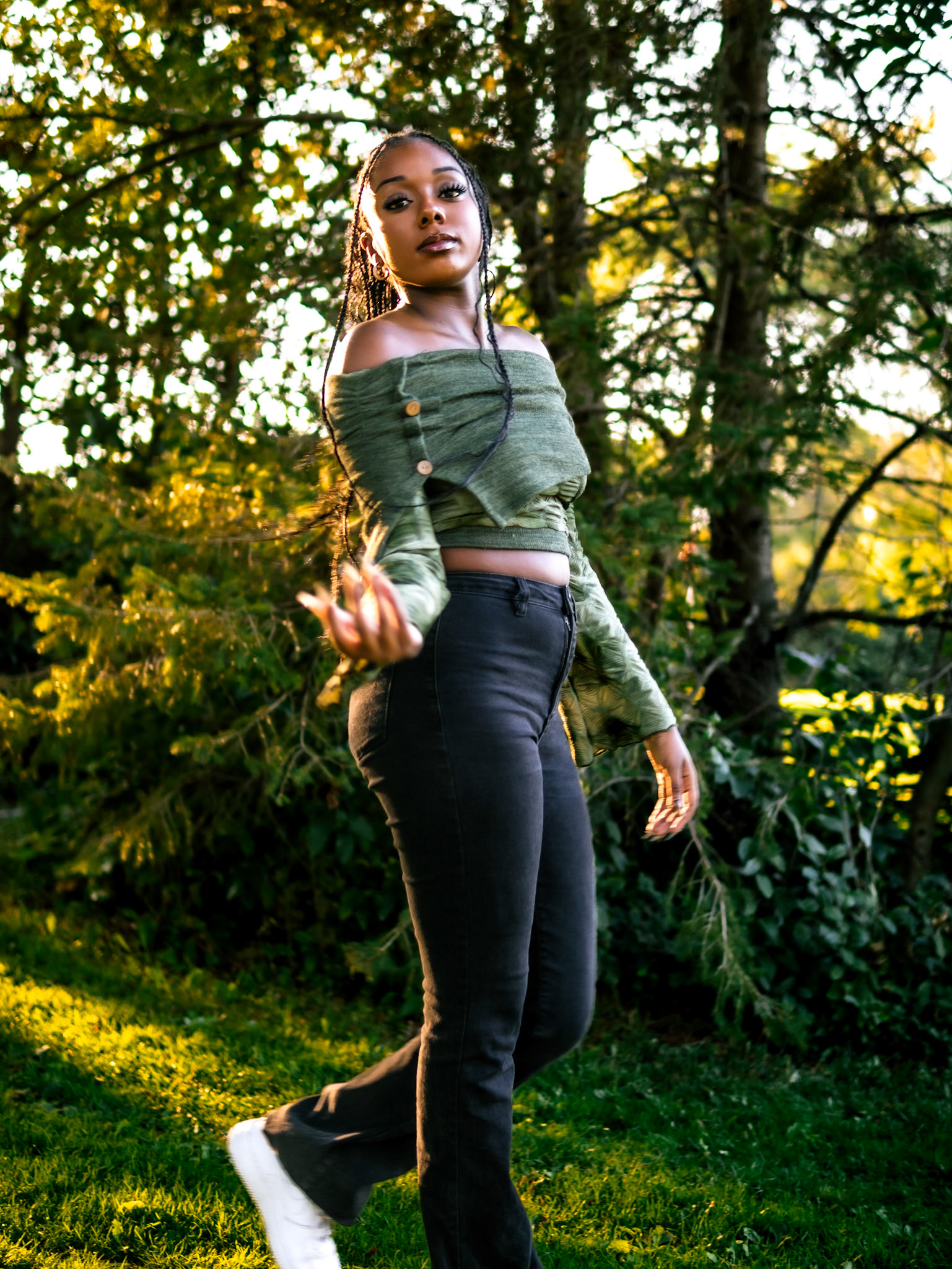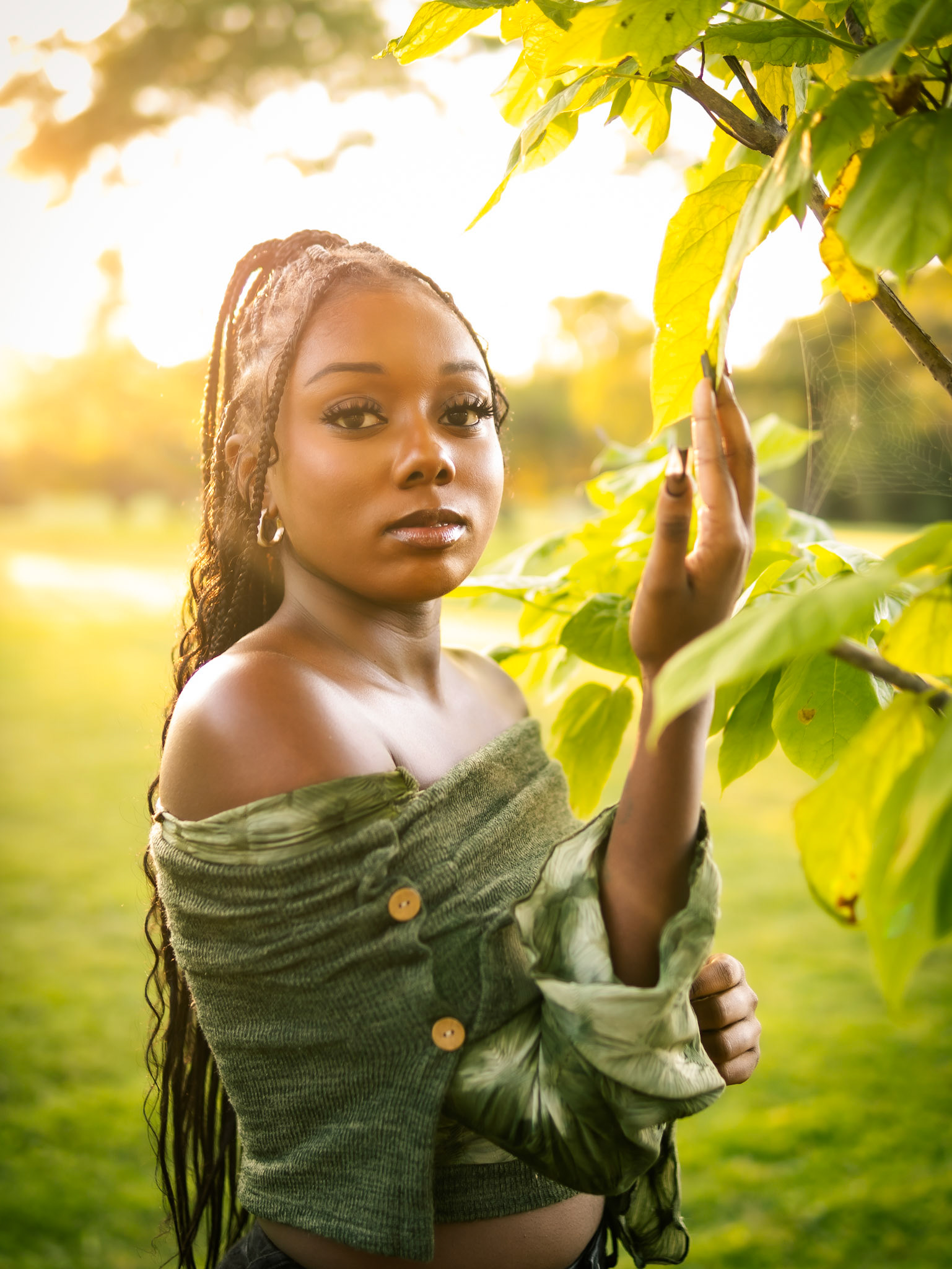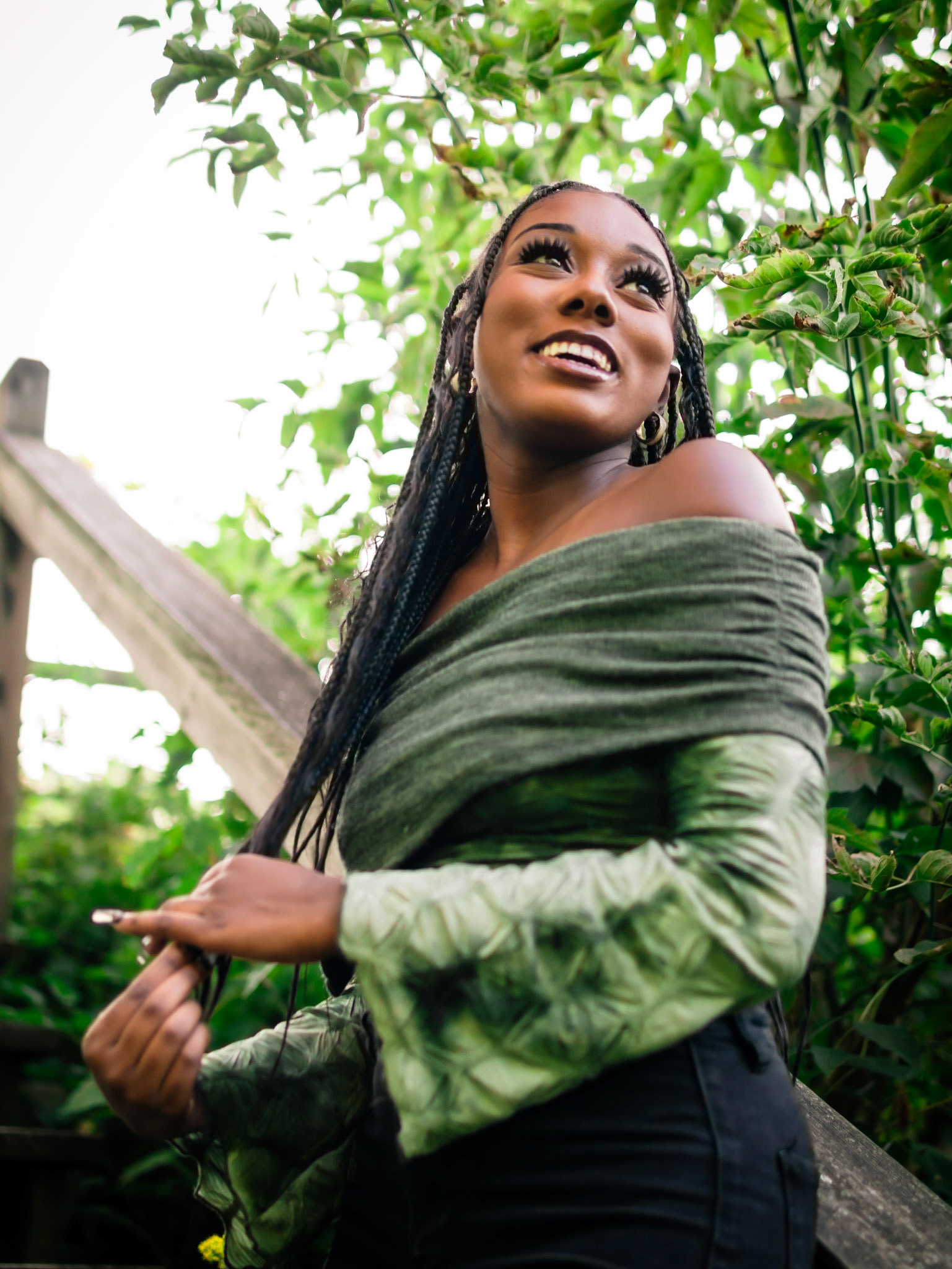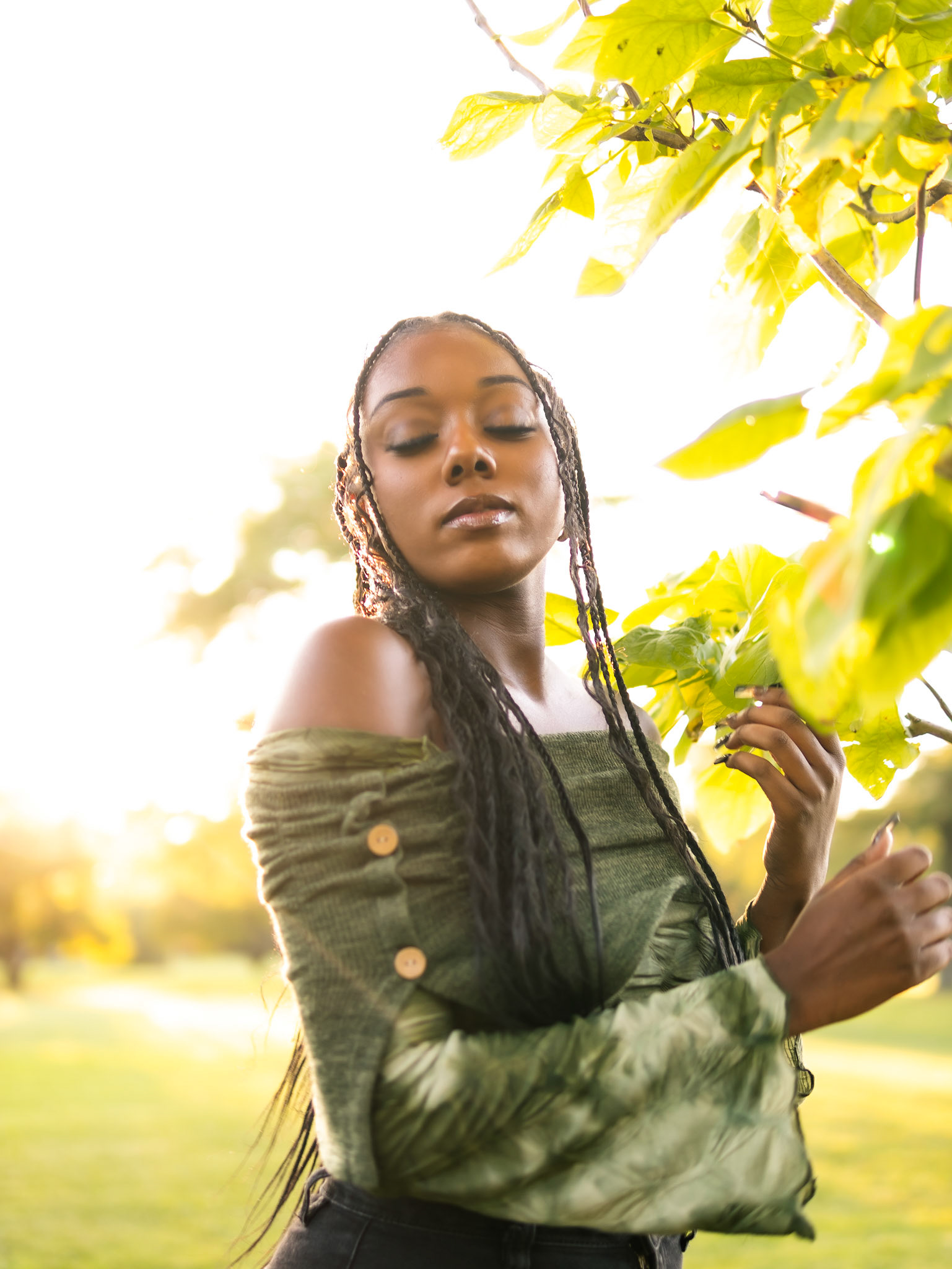 A refreshing nature photoshoot, perfectly blending a vibrant green-themed outfit with the beauty of the outdoors.