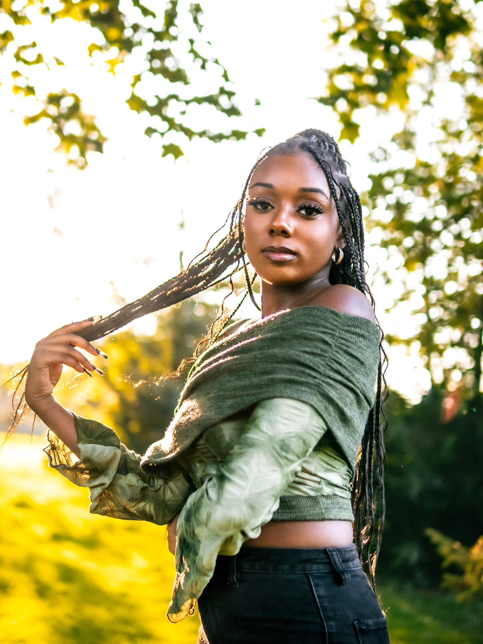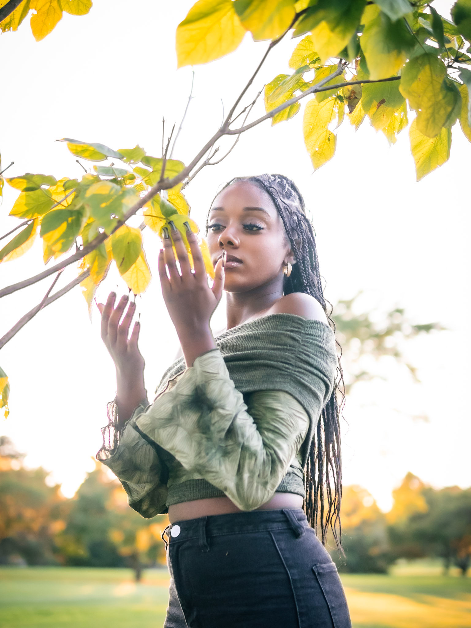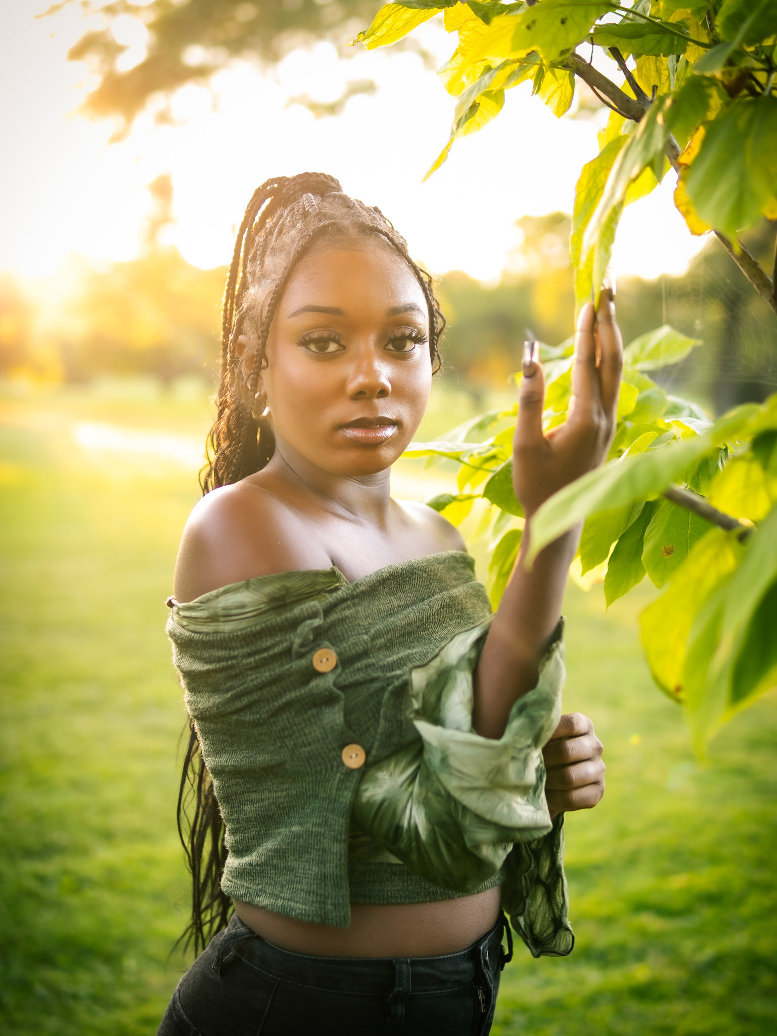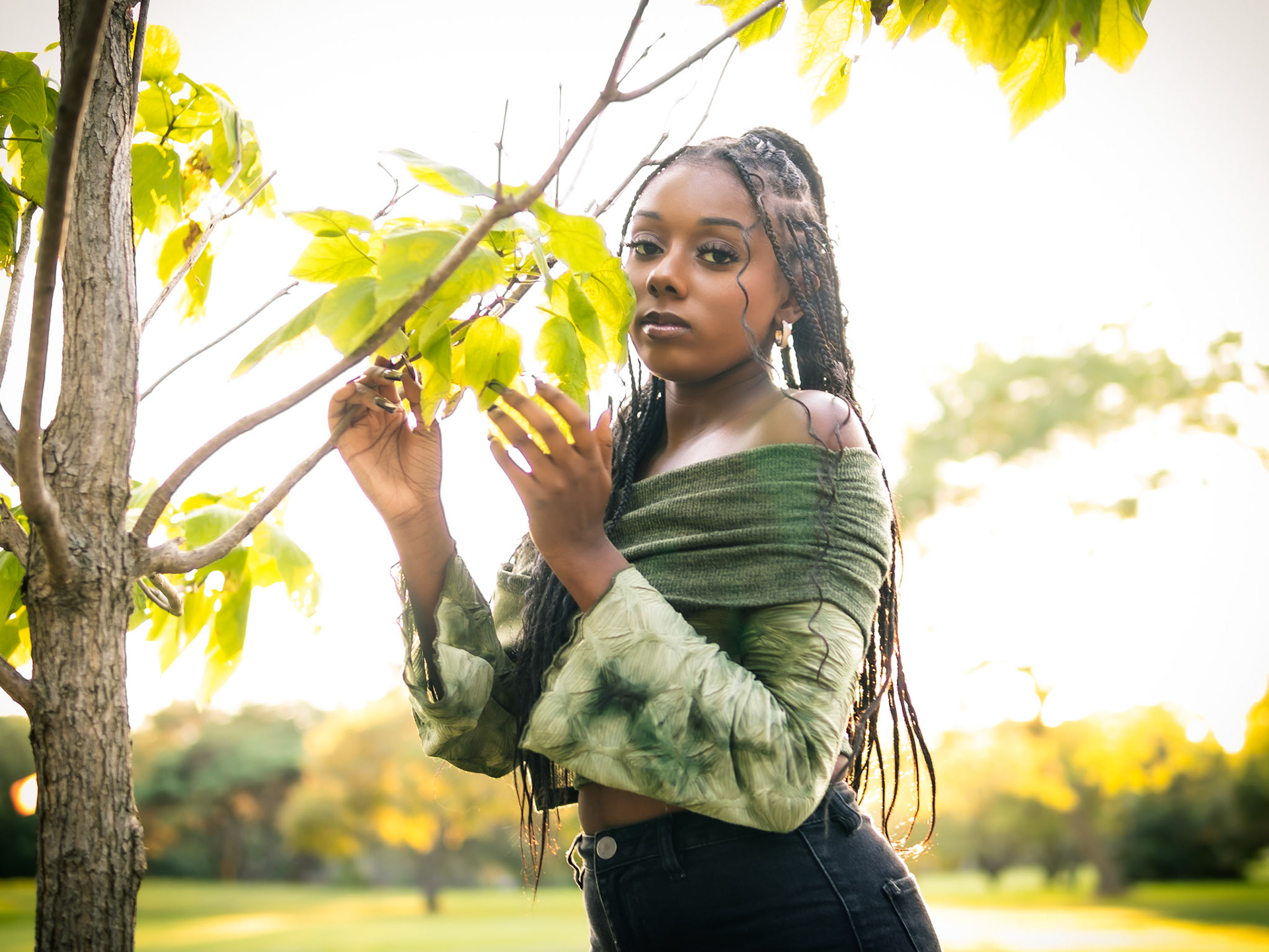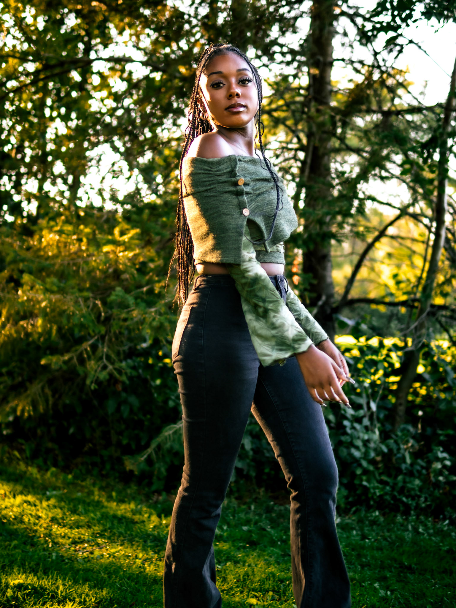 A refreshing nature photoshoot, perfectly blending a vibrant green-themed outfit with the beauty of the outdoors.