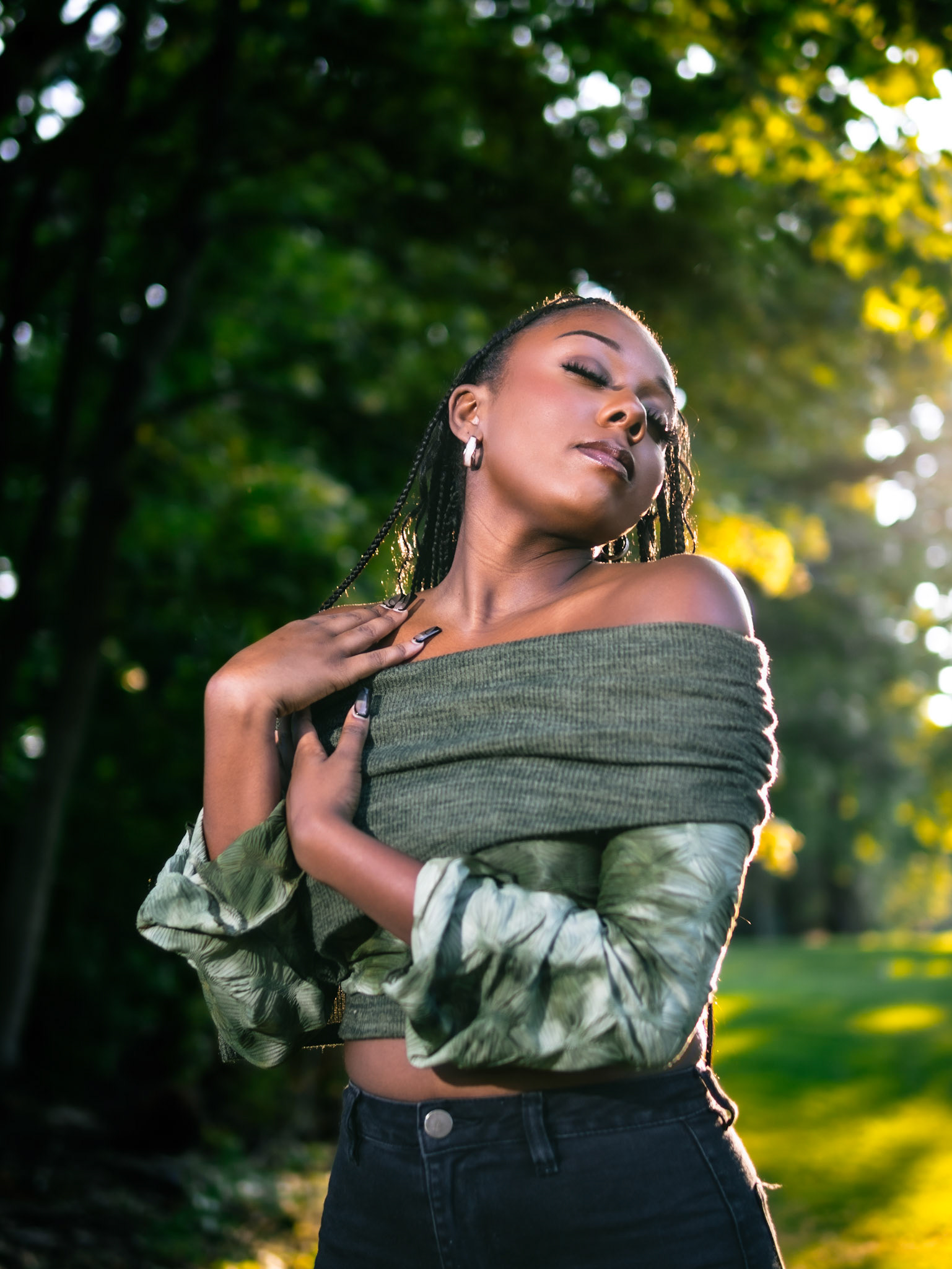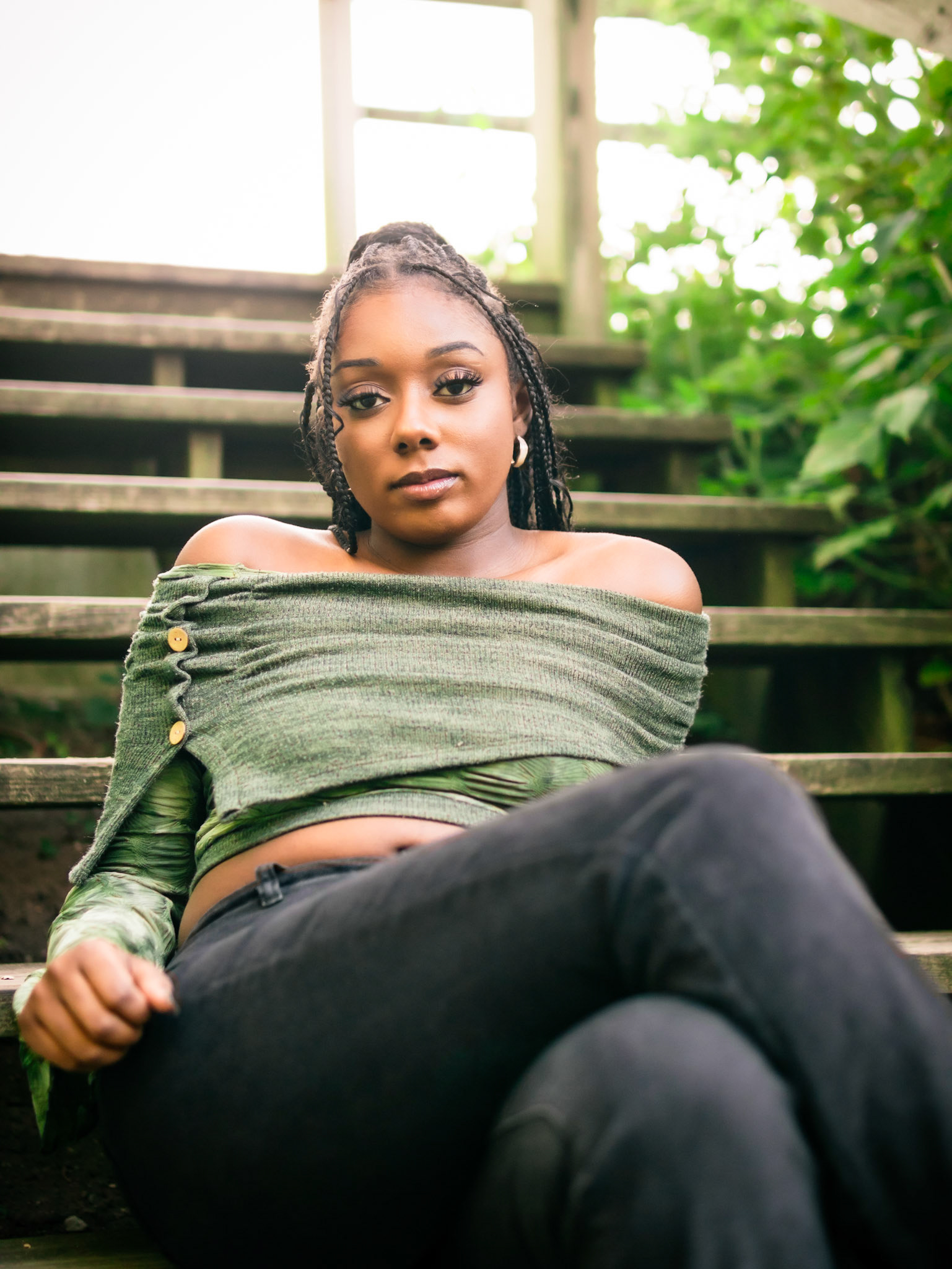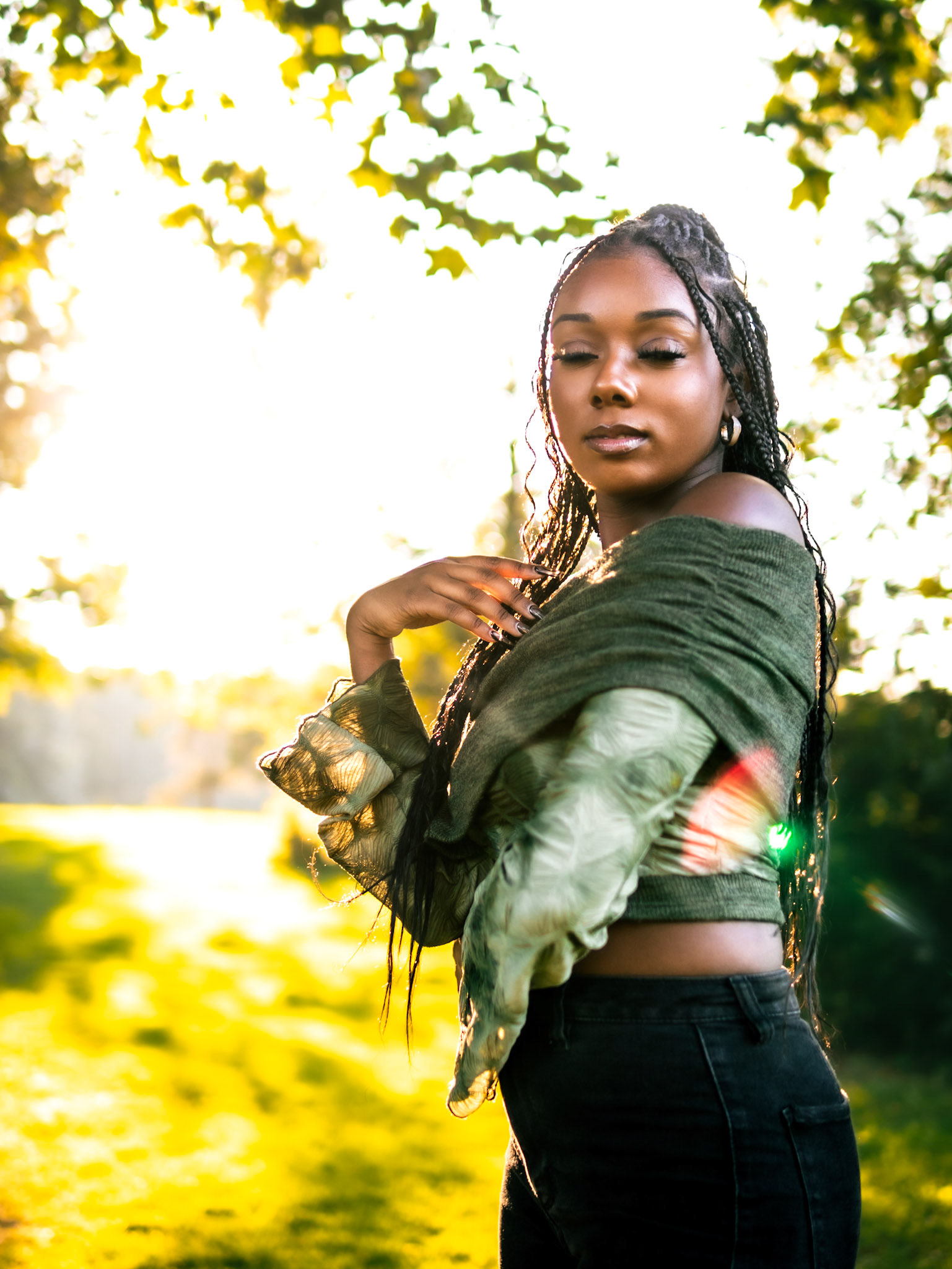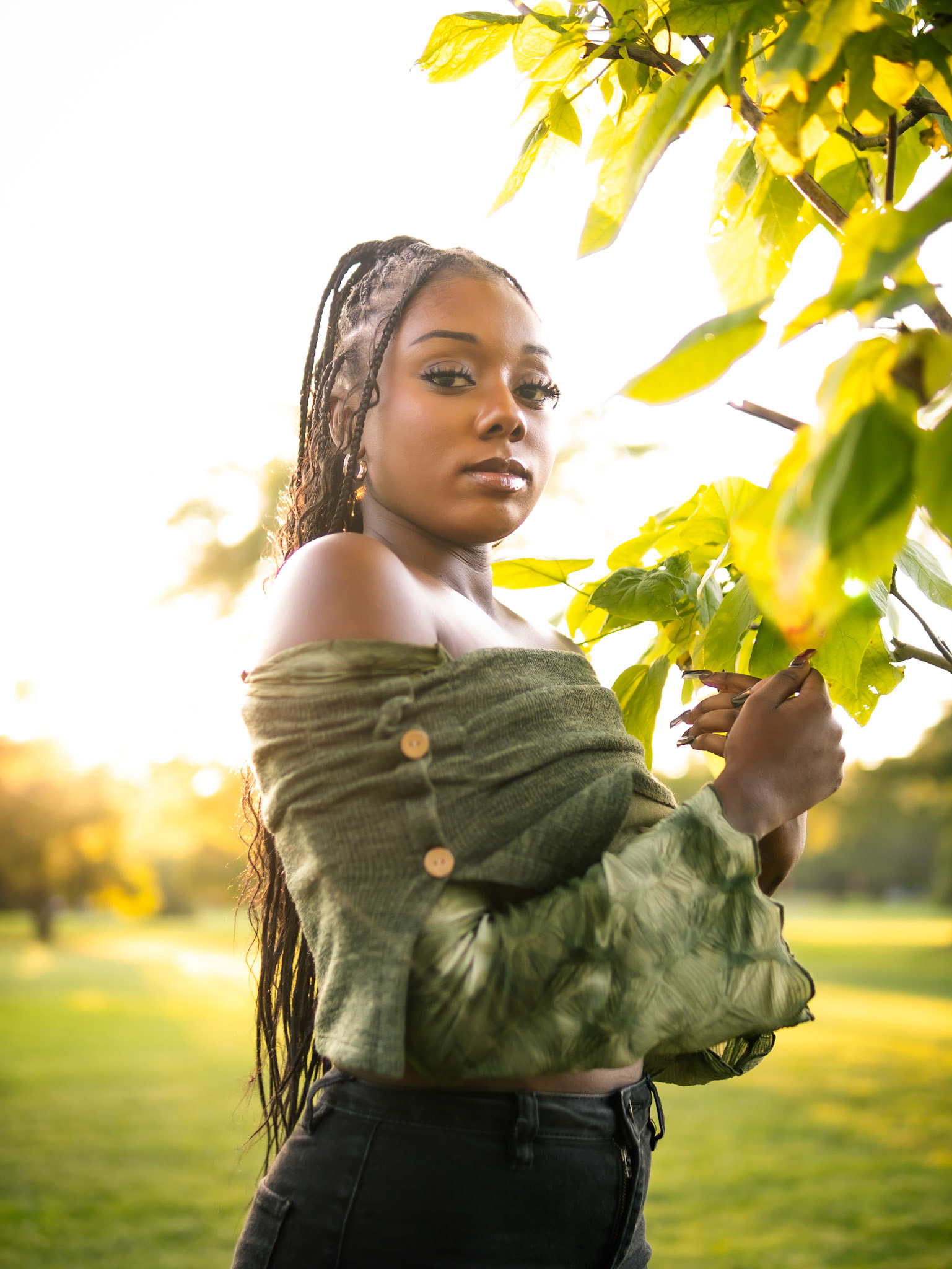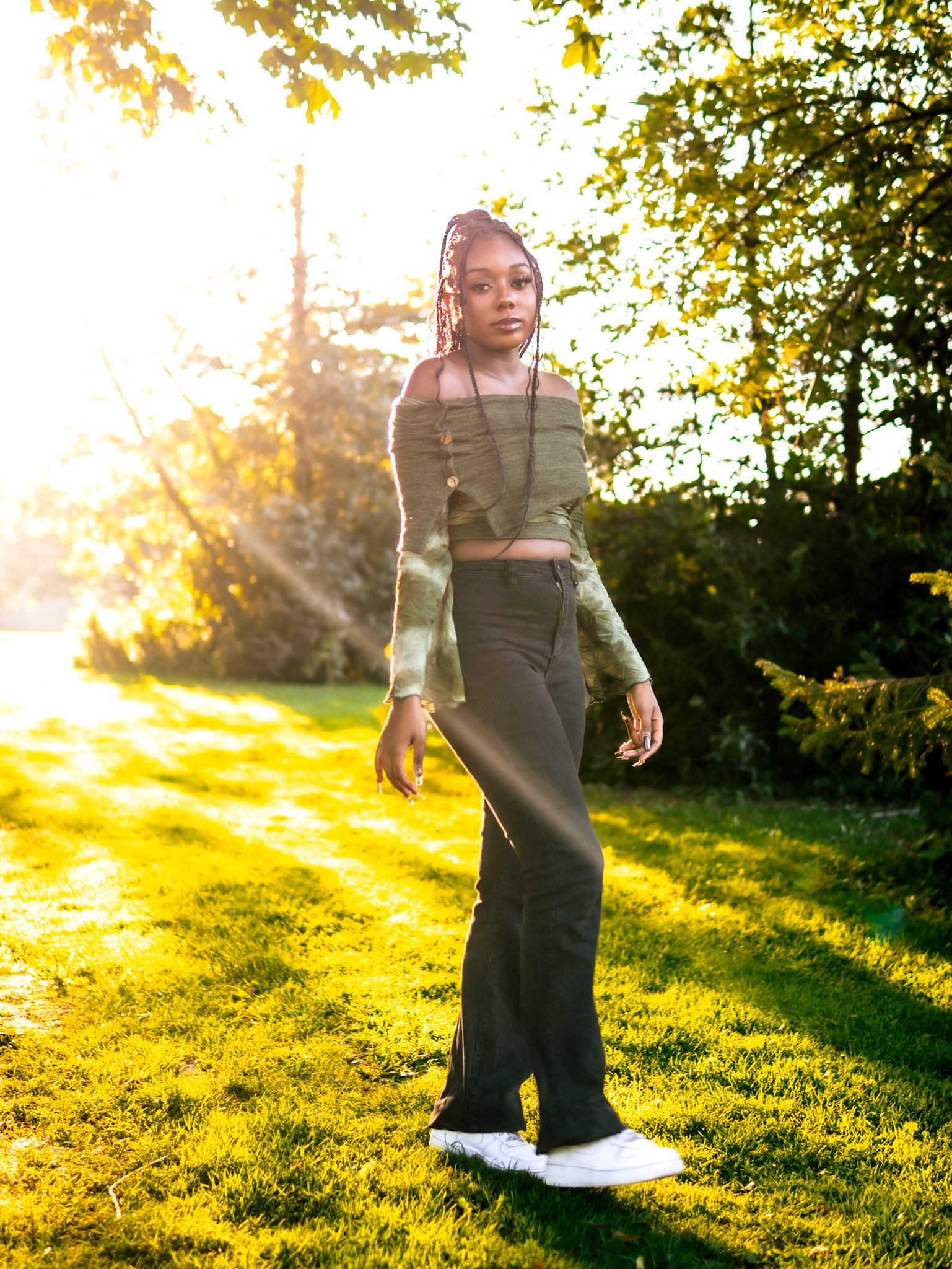 A refreshing nature photoshoot, perfectly blending a vibrant green-themed outfit with the beauty of the outdoors.