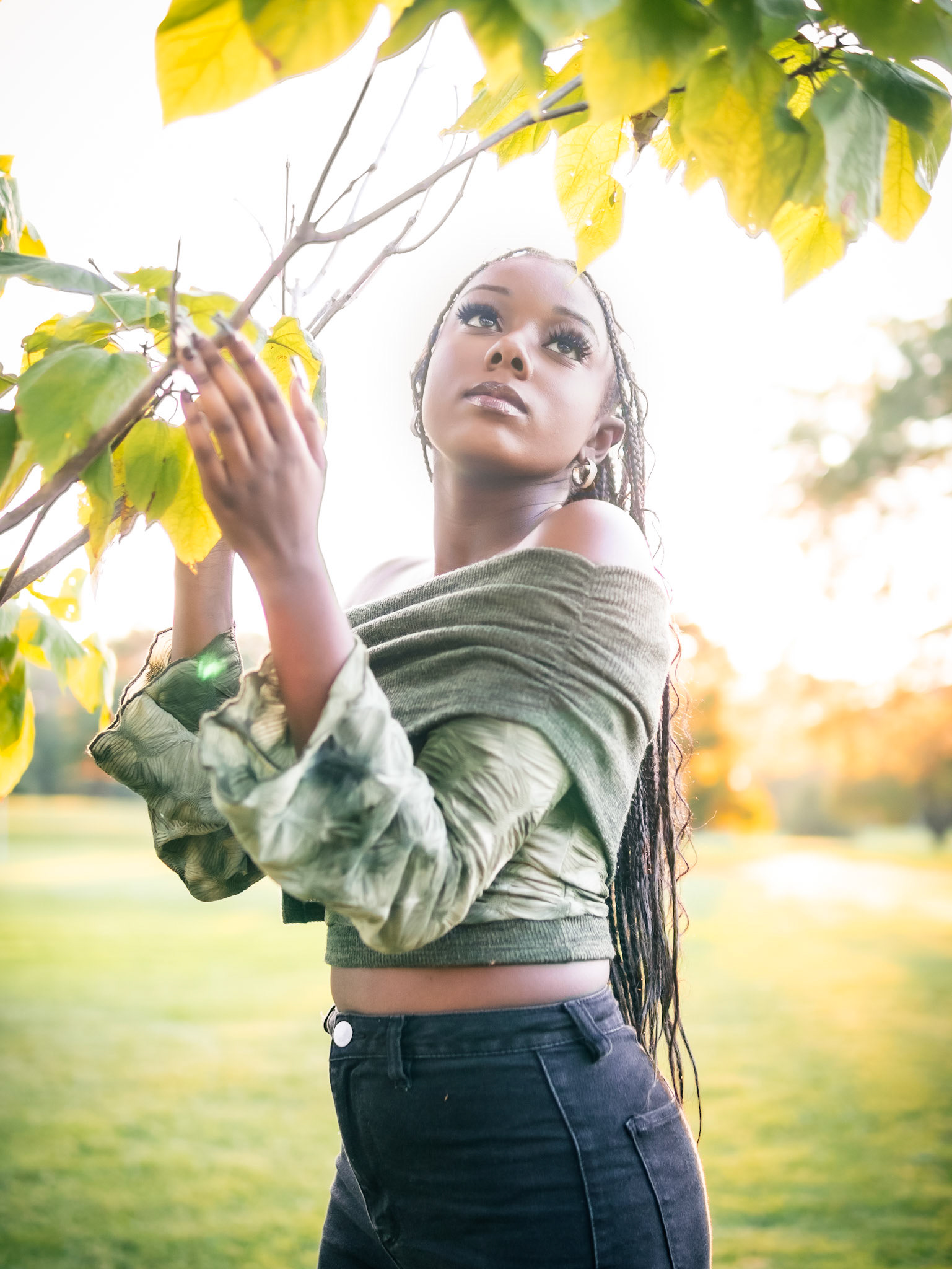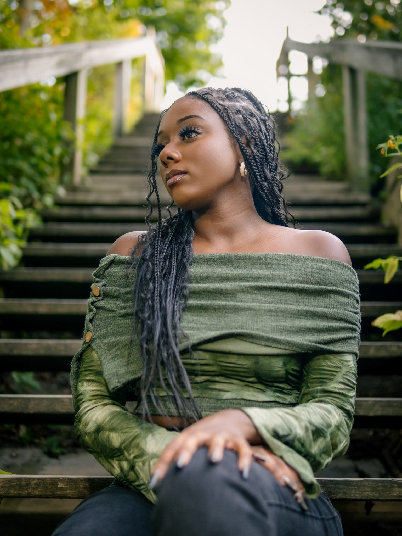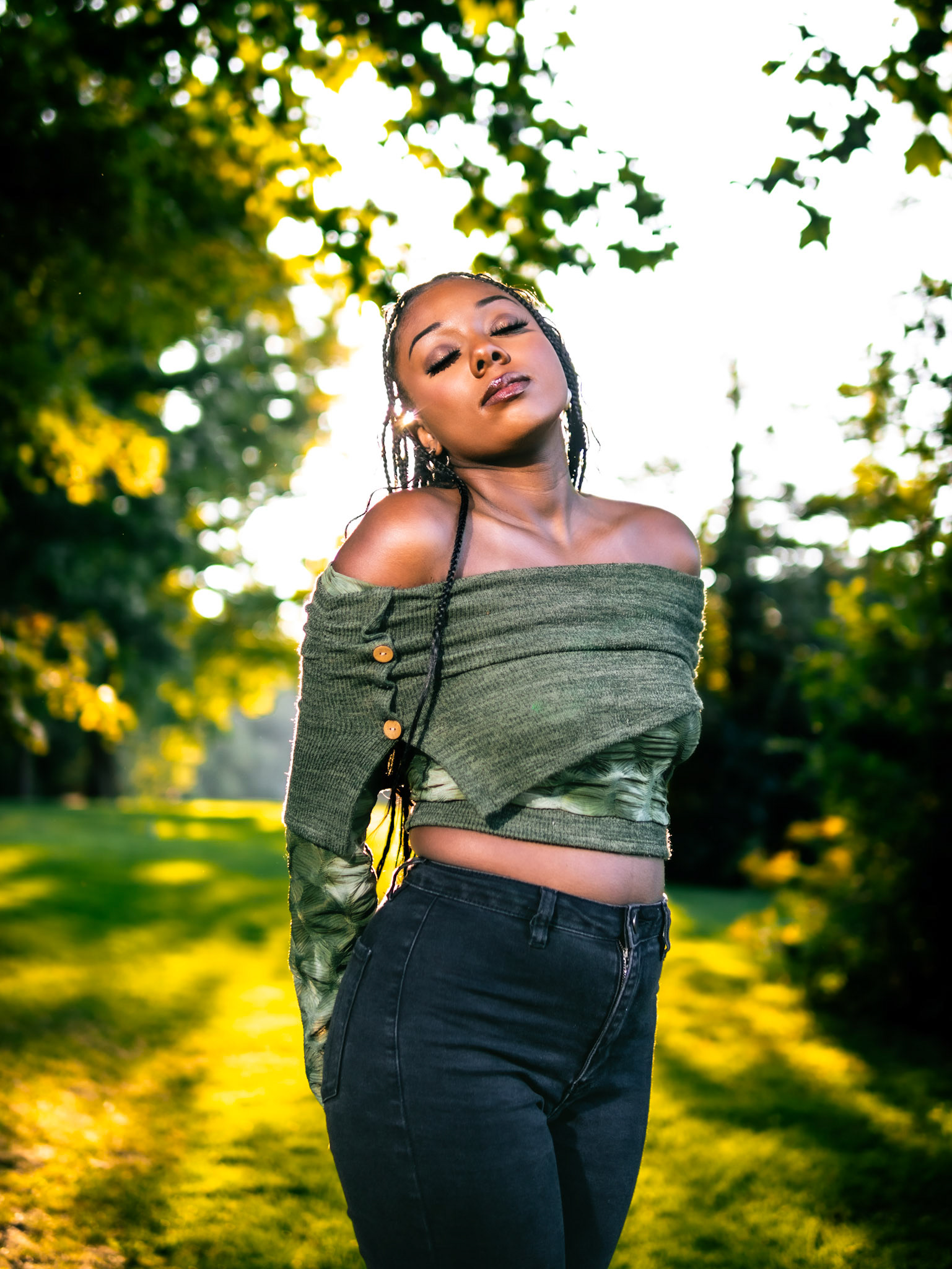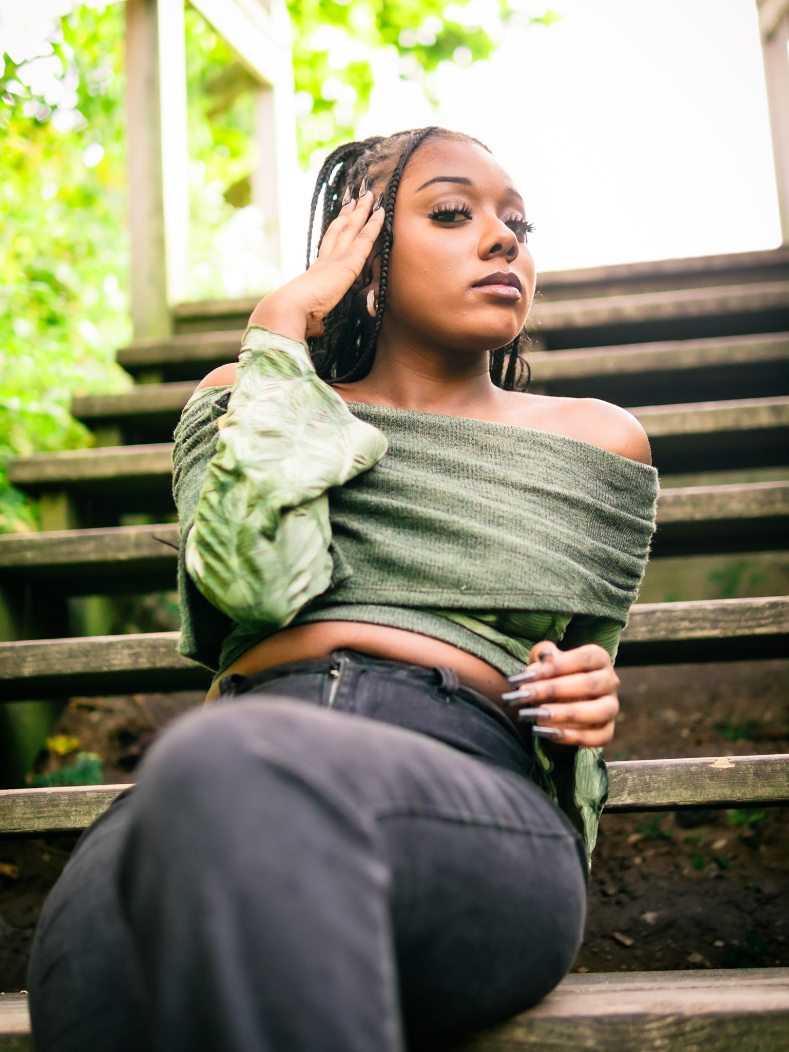 A refreshing nature photoshoot, perfectly blending a vibrant green-themed outfit with the beauty of the outdoors.