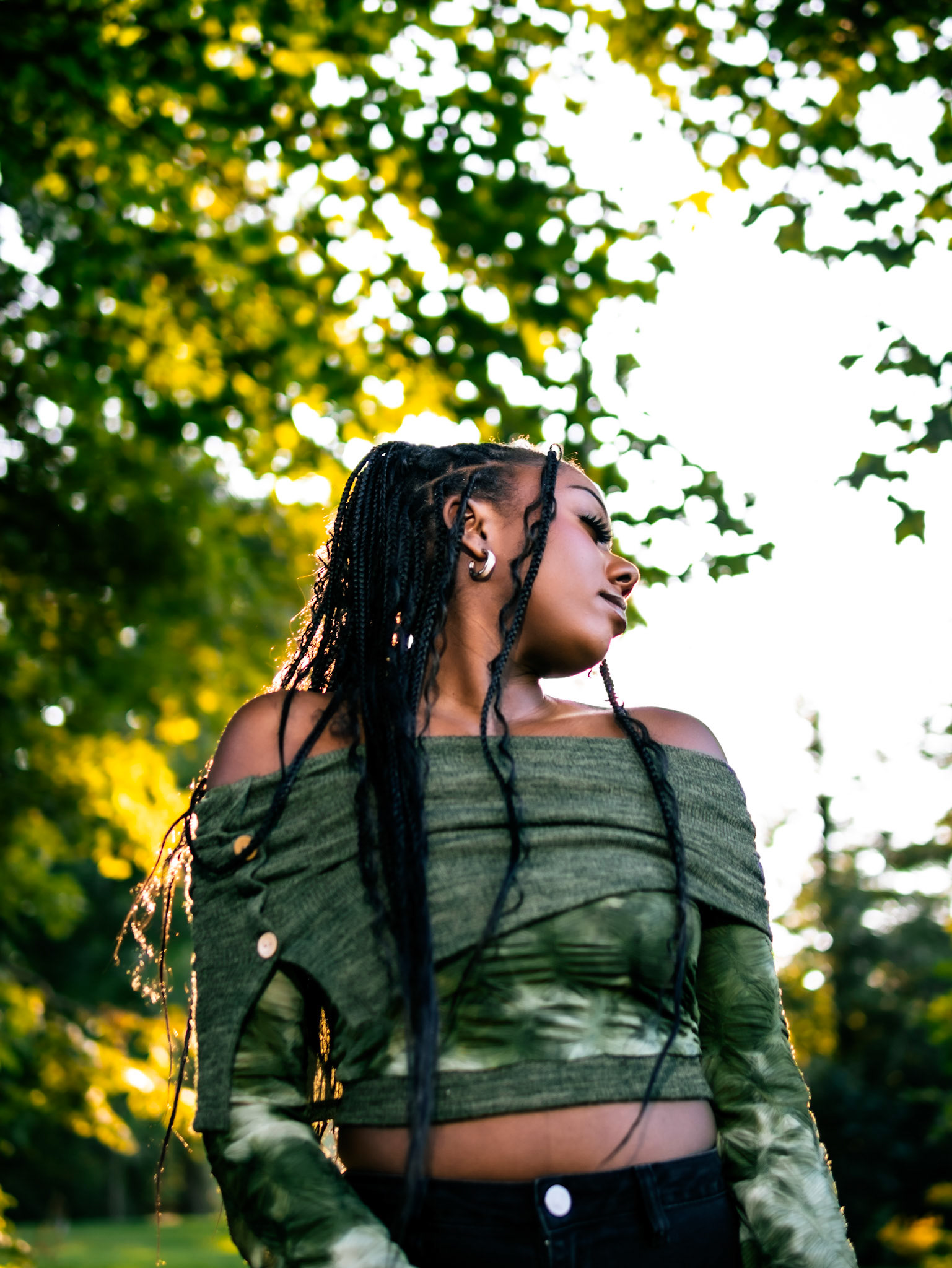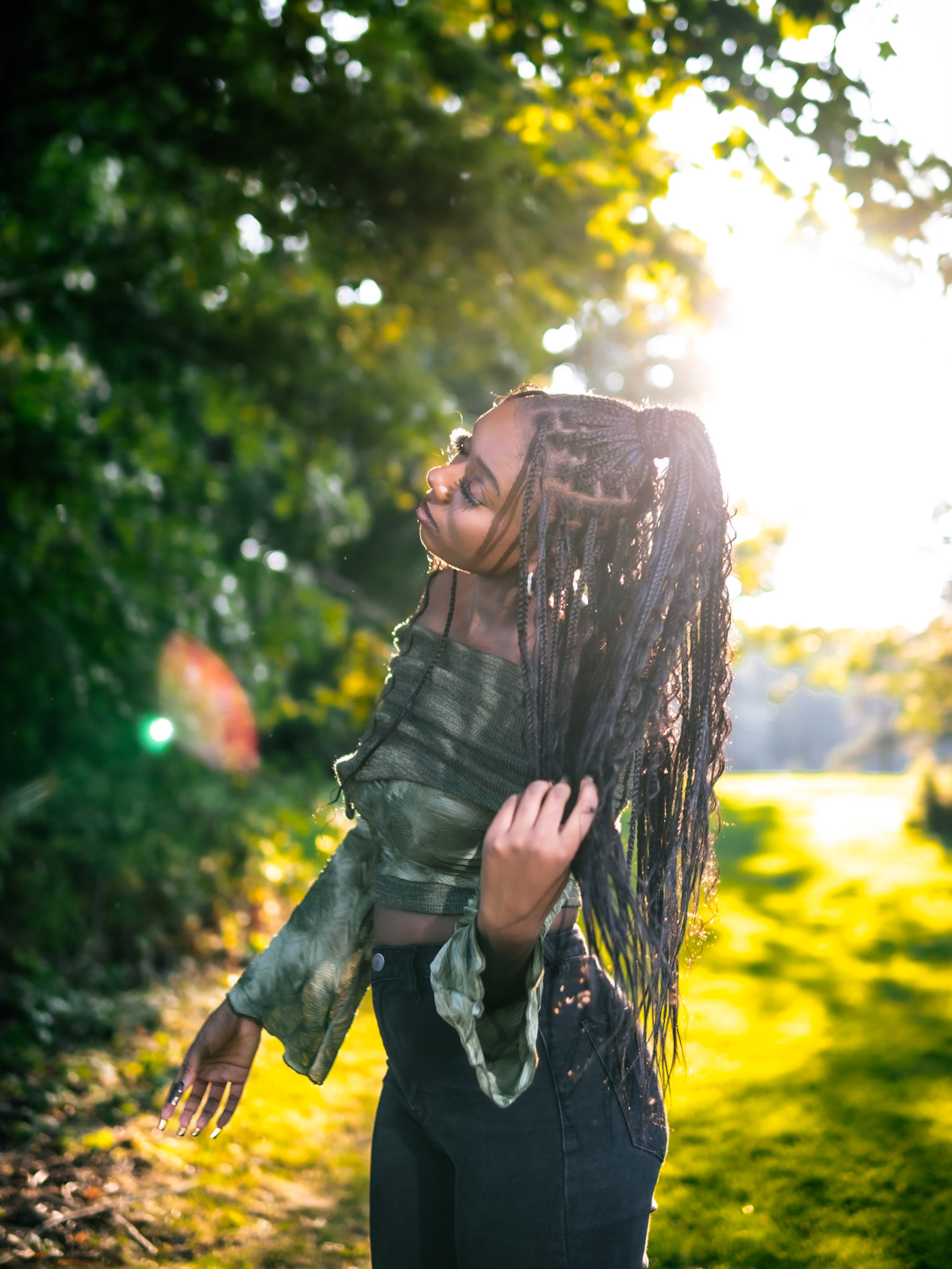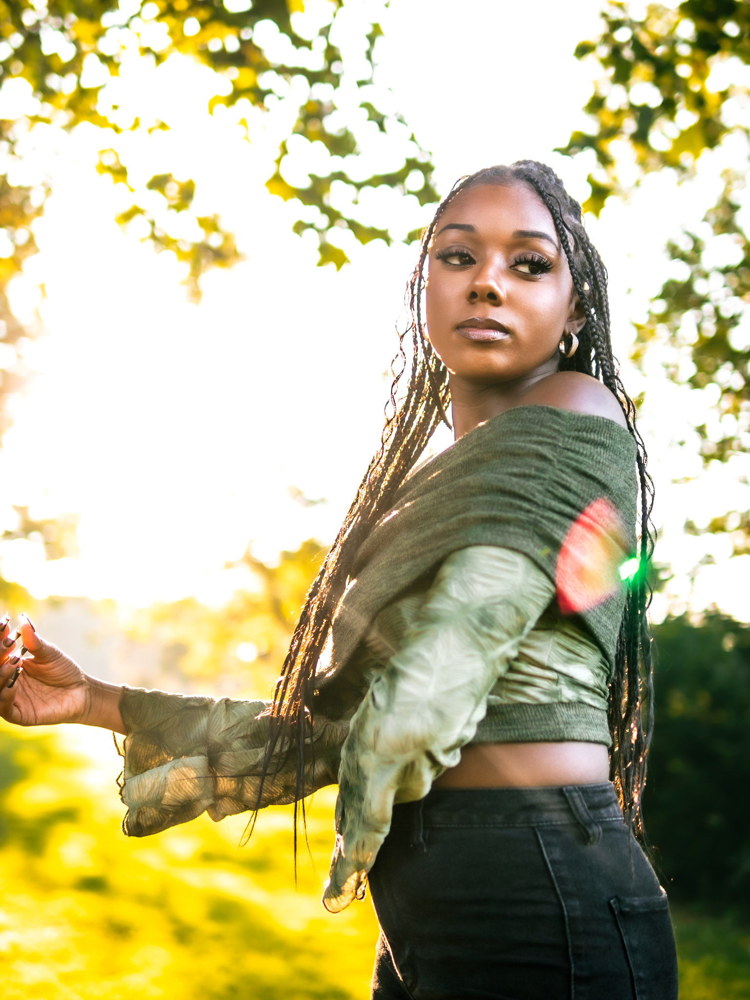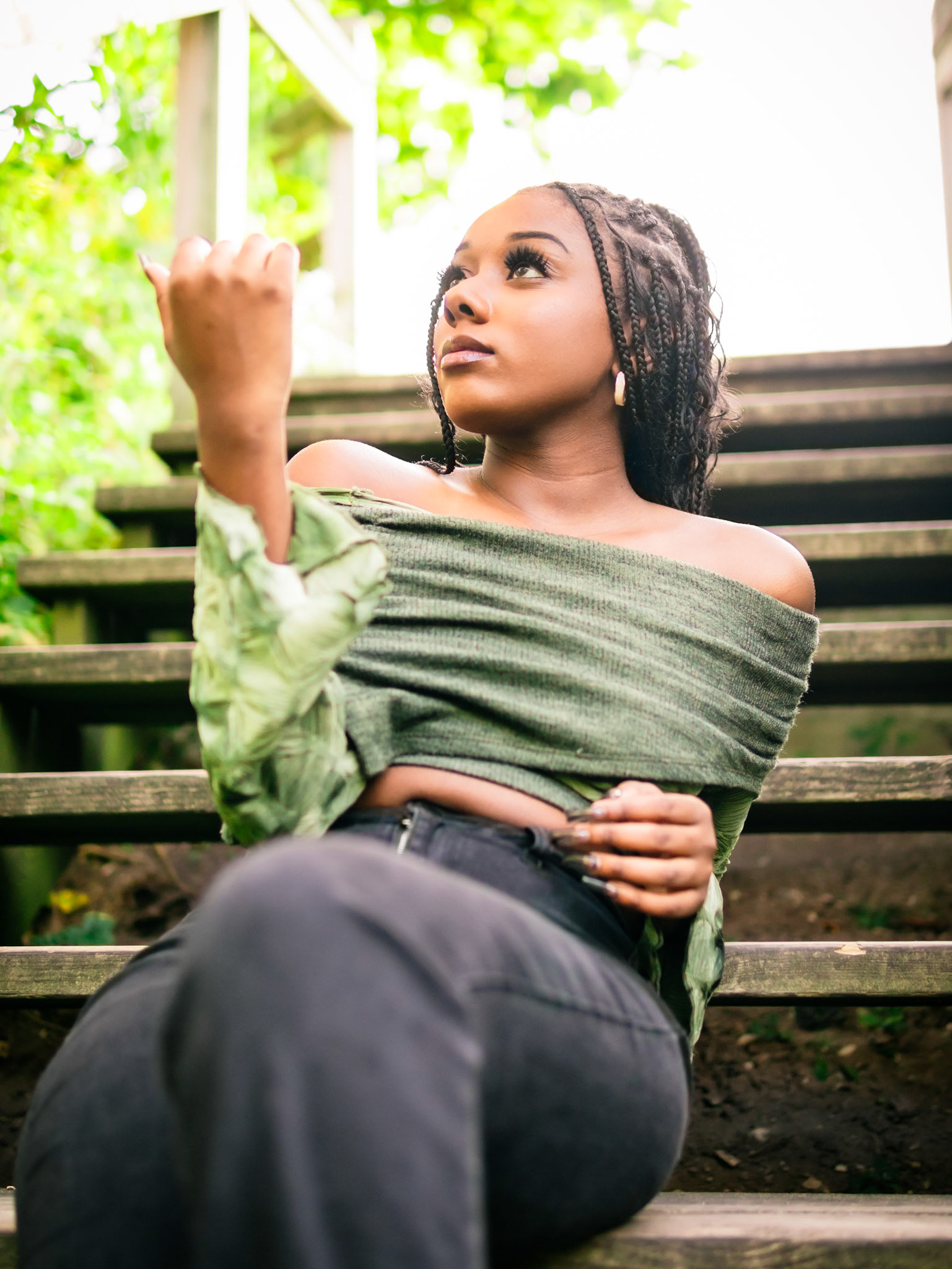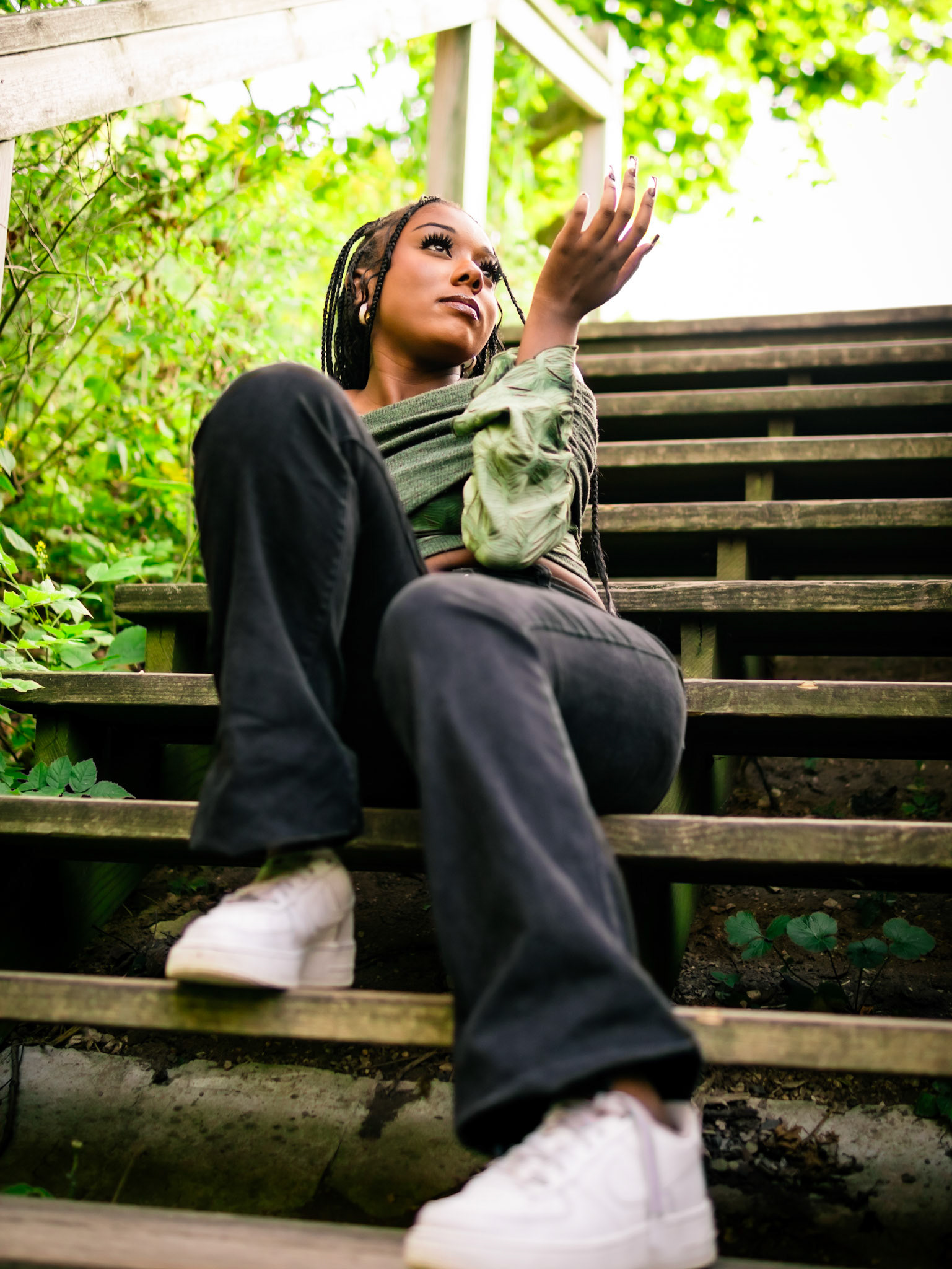 A refreshing nature photoshoot, perfectly blending a vibrant green-themed outfit with the beauty of the outdoors.