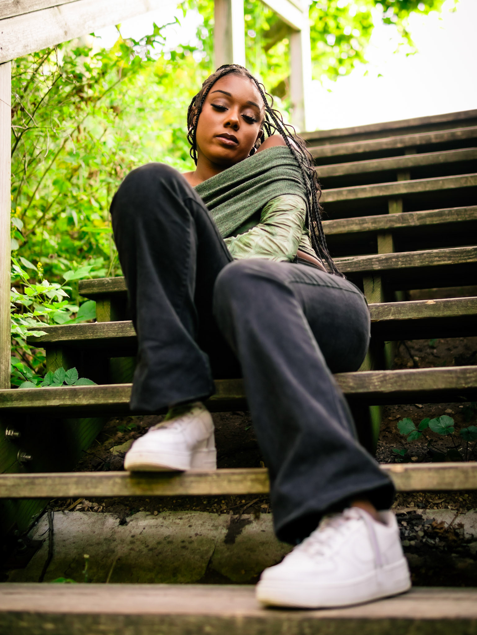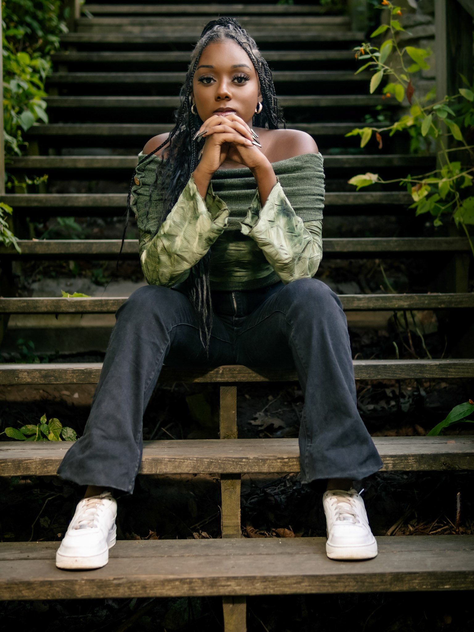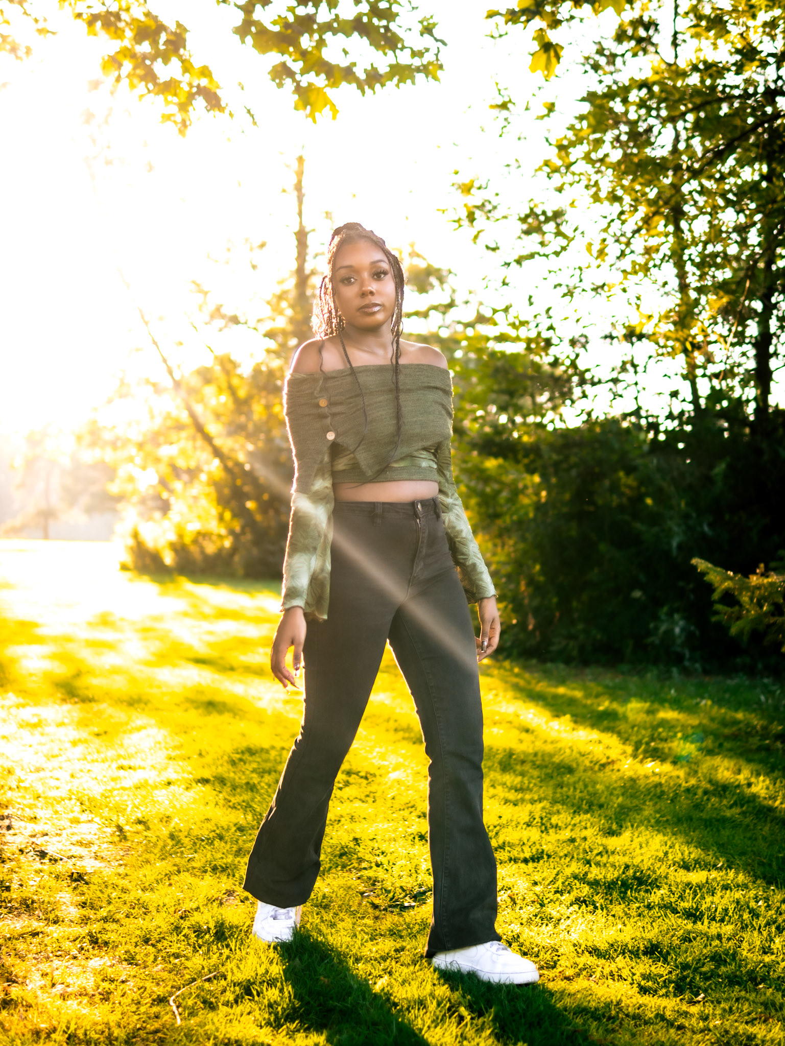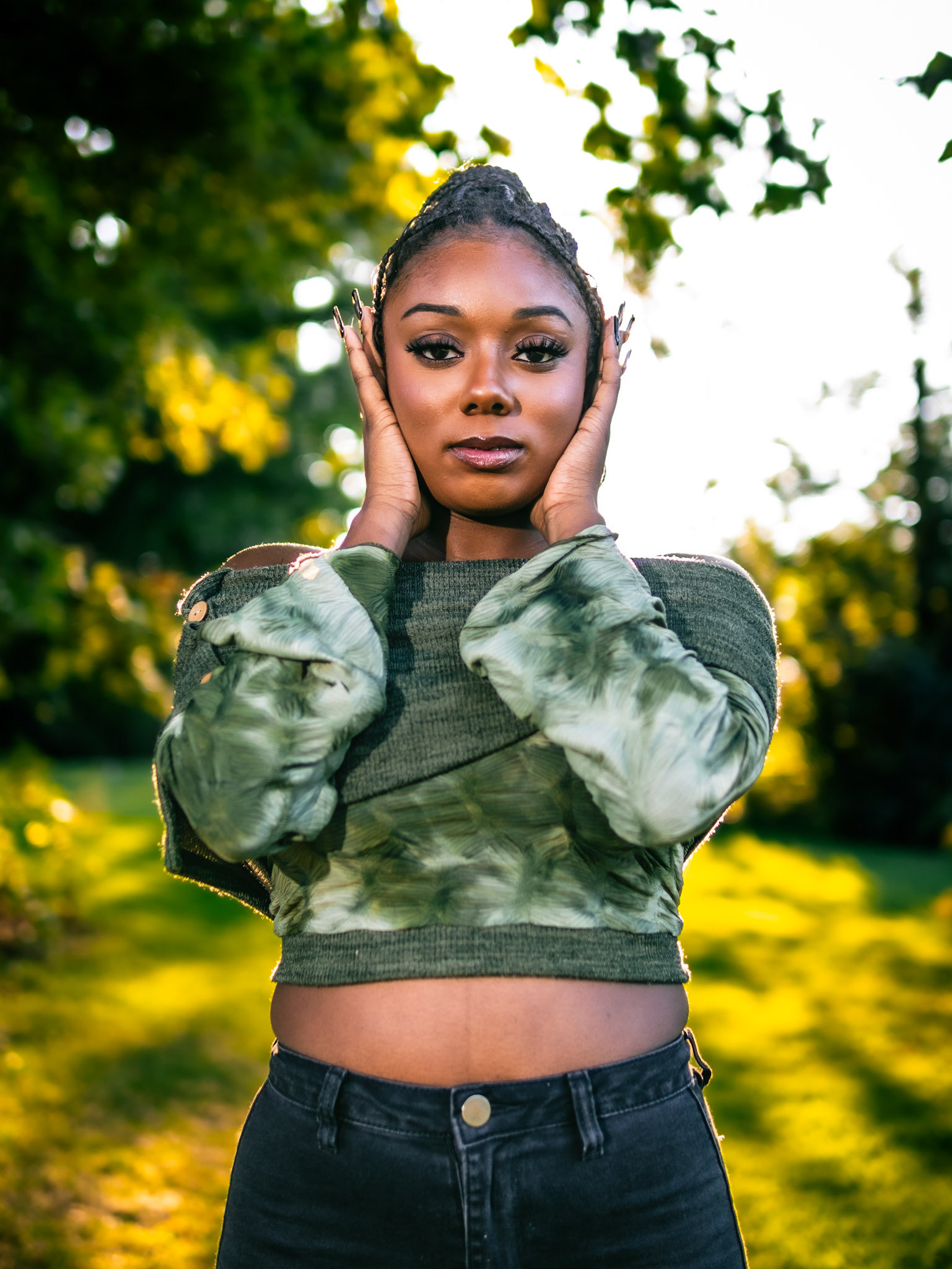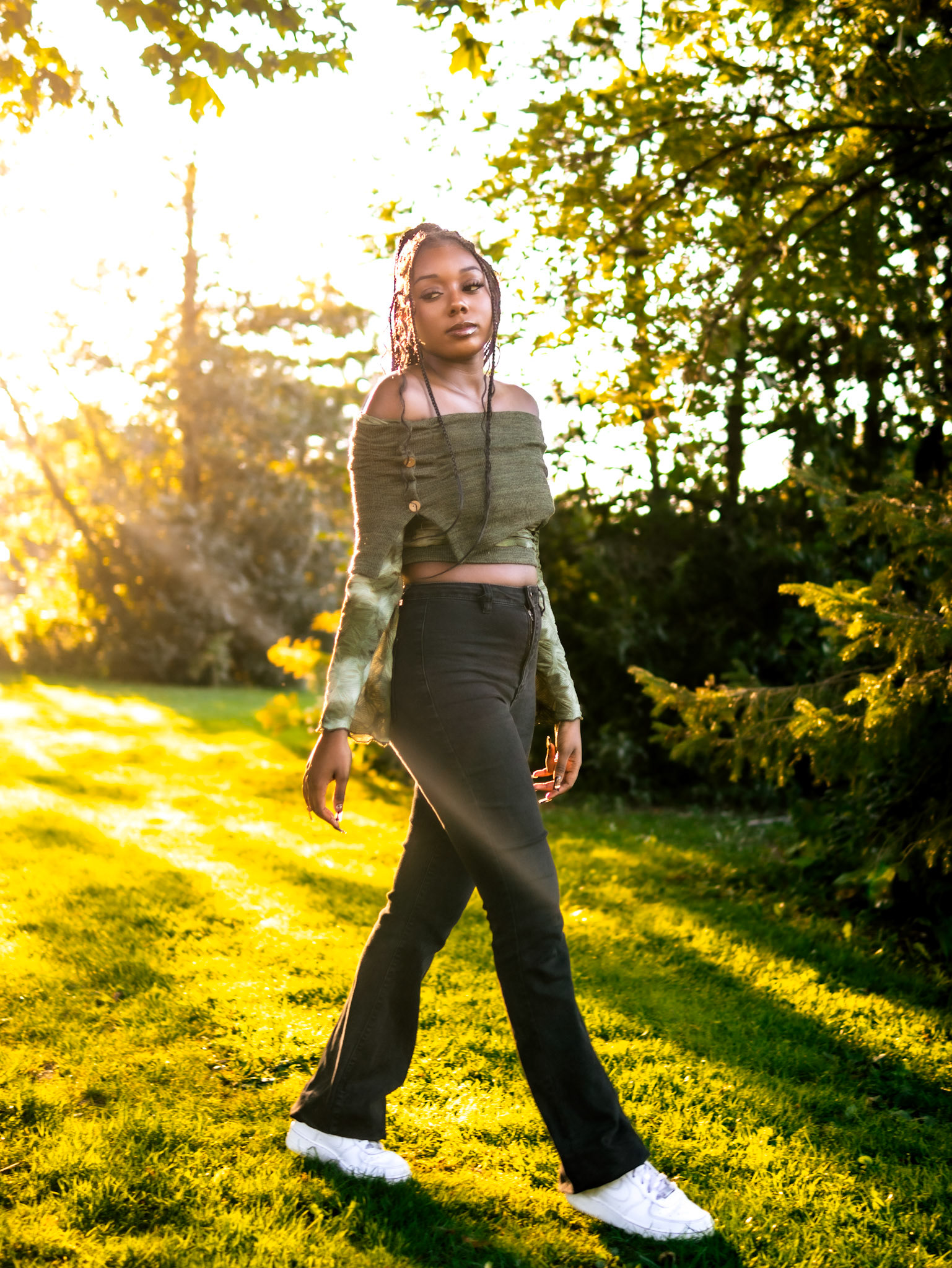 A refreshing nature photoshoot, perfectly blending a vibrant green-themed outfit with the beauty of the outdoors.
