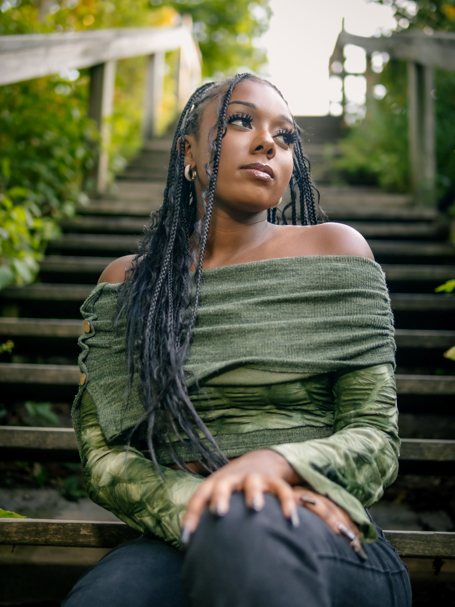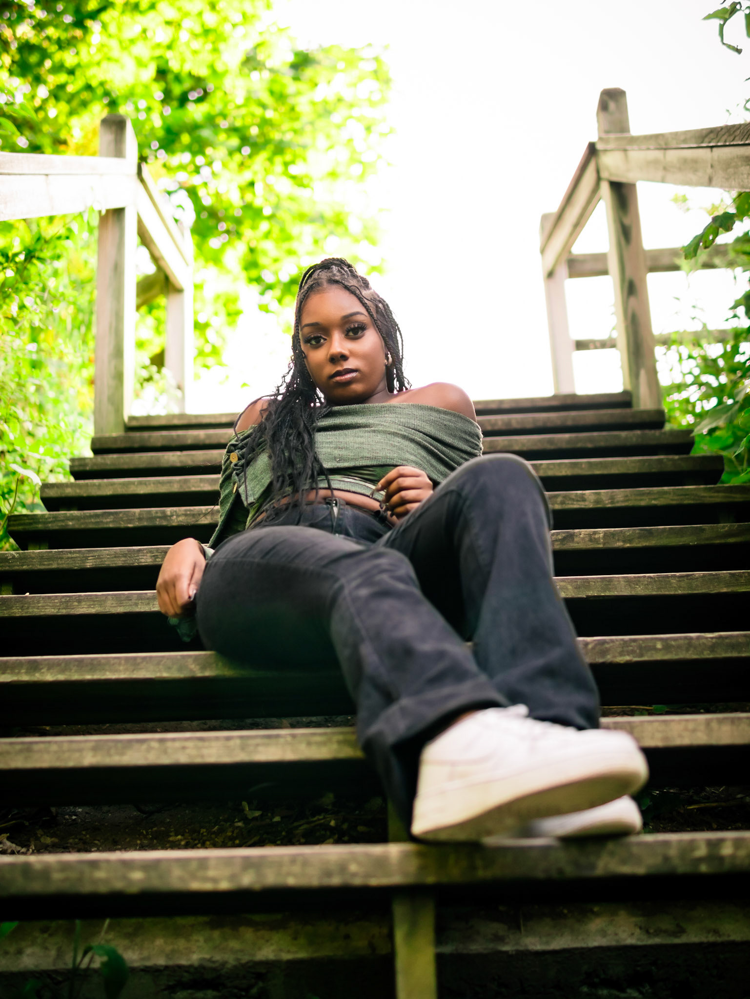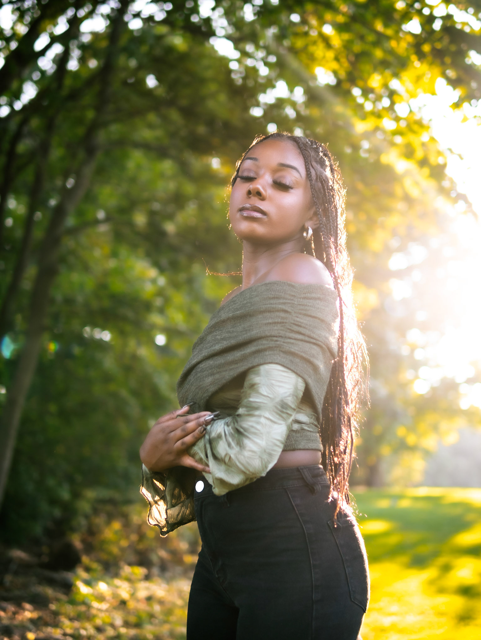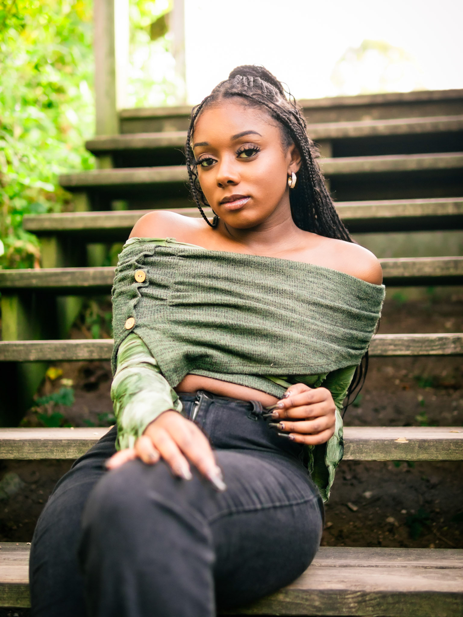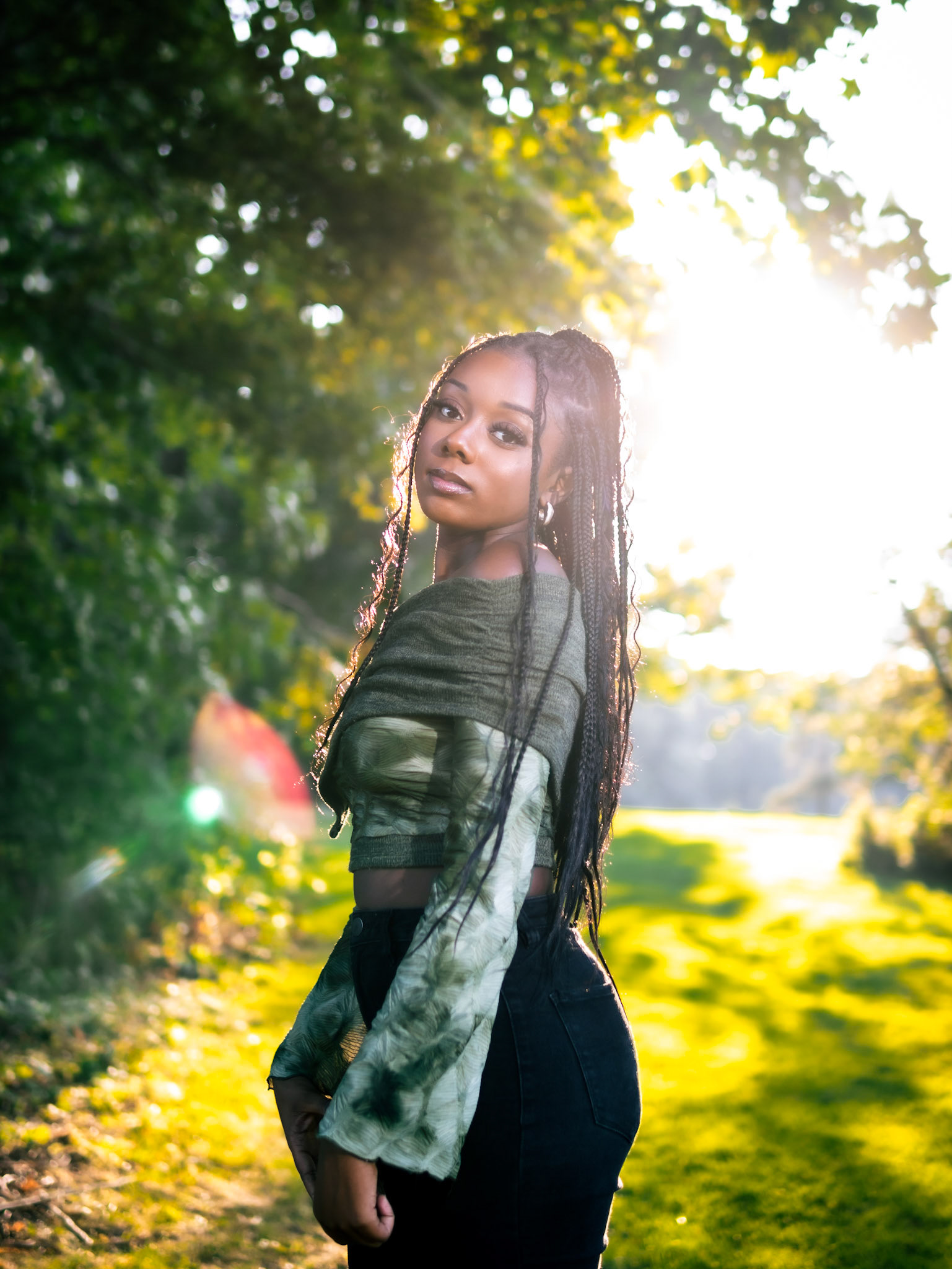 A refreshing nature photoshoot, perfectly blending a vibrant green-themed outfit with the beauty of the outdoors.