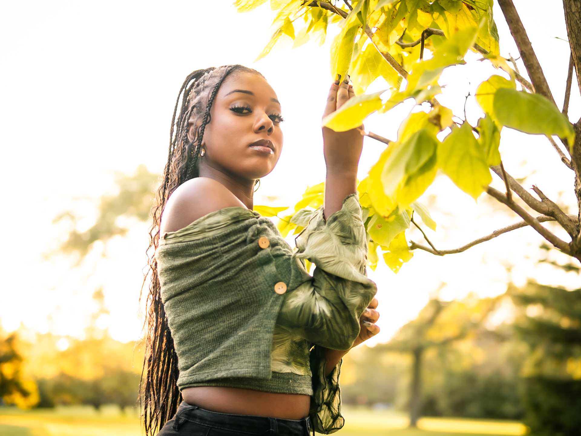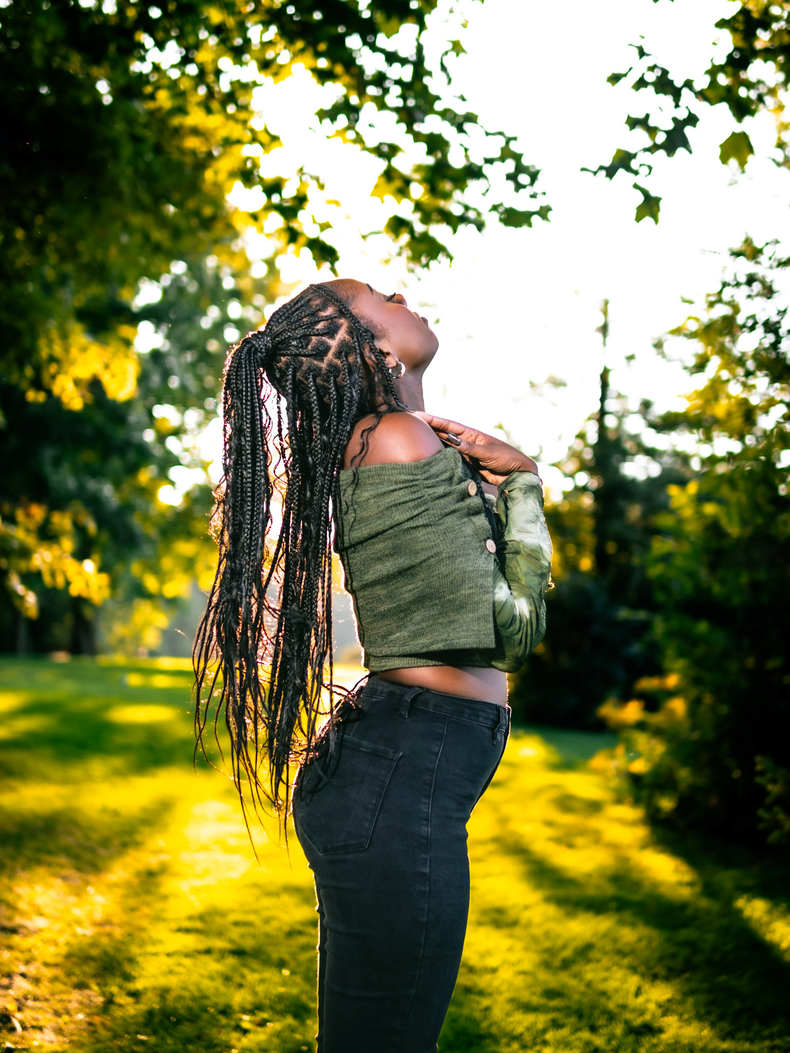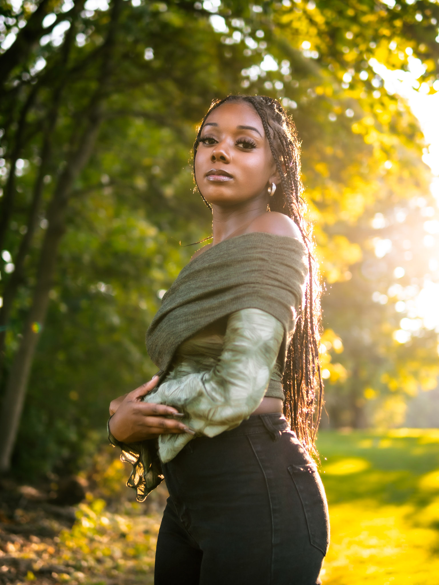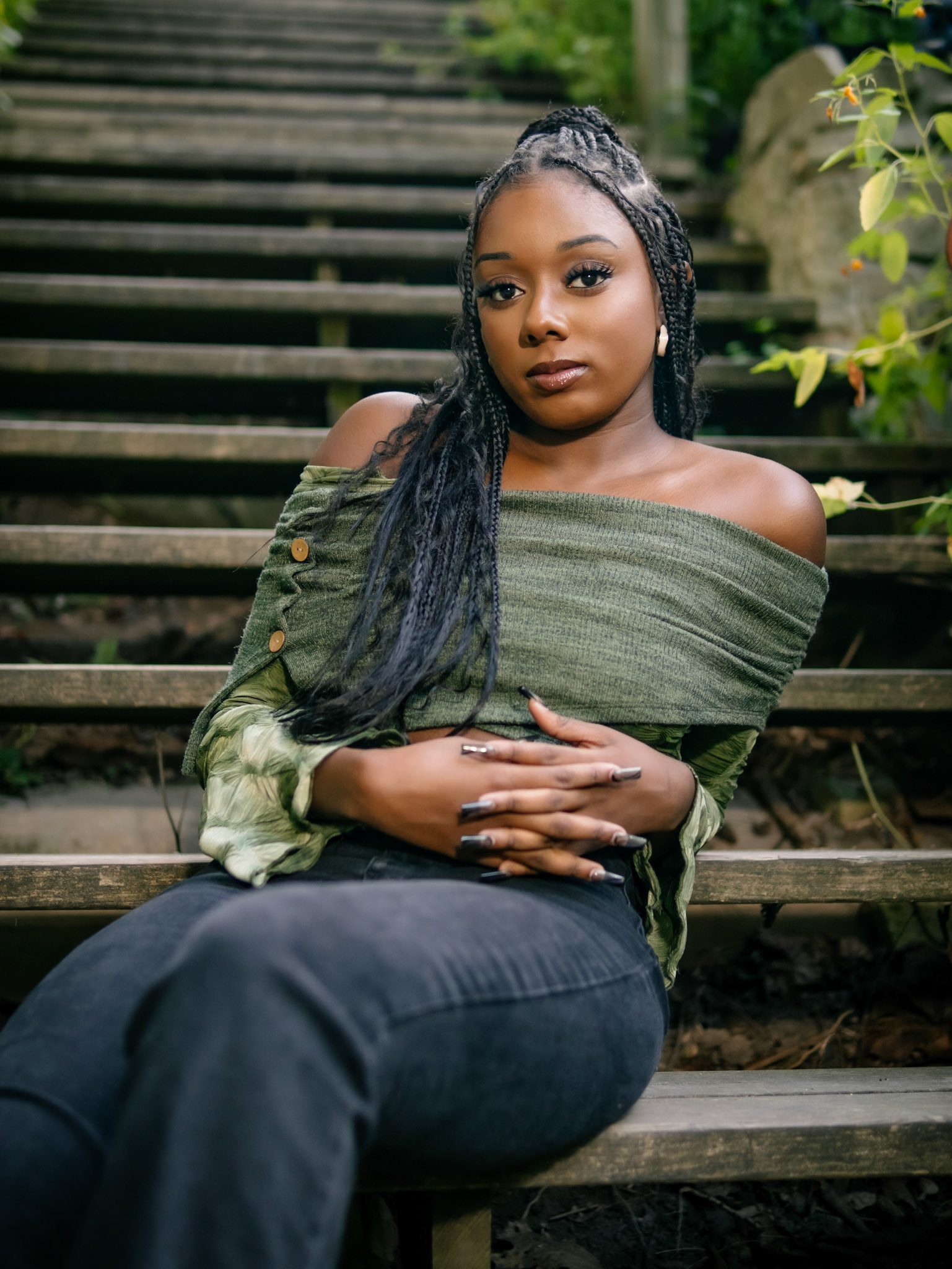 A refreshing nature photoshoot, perfectly blending a vibrant green-themed outfit with the beauty of the outdoors.