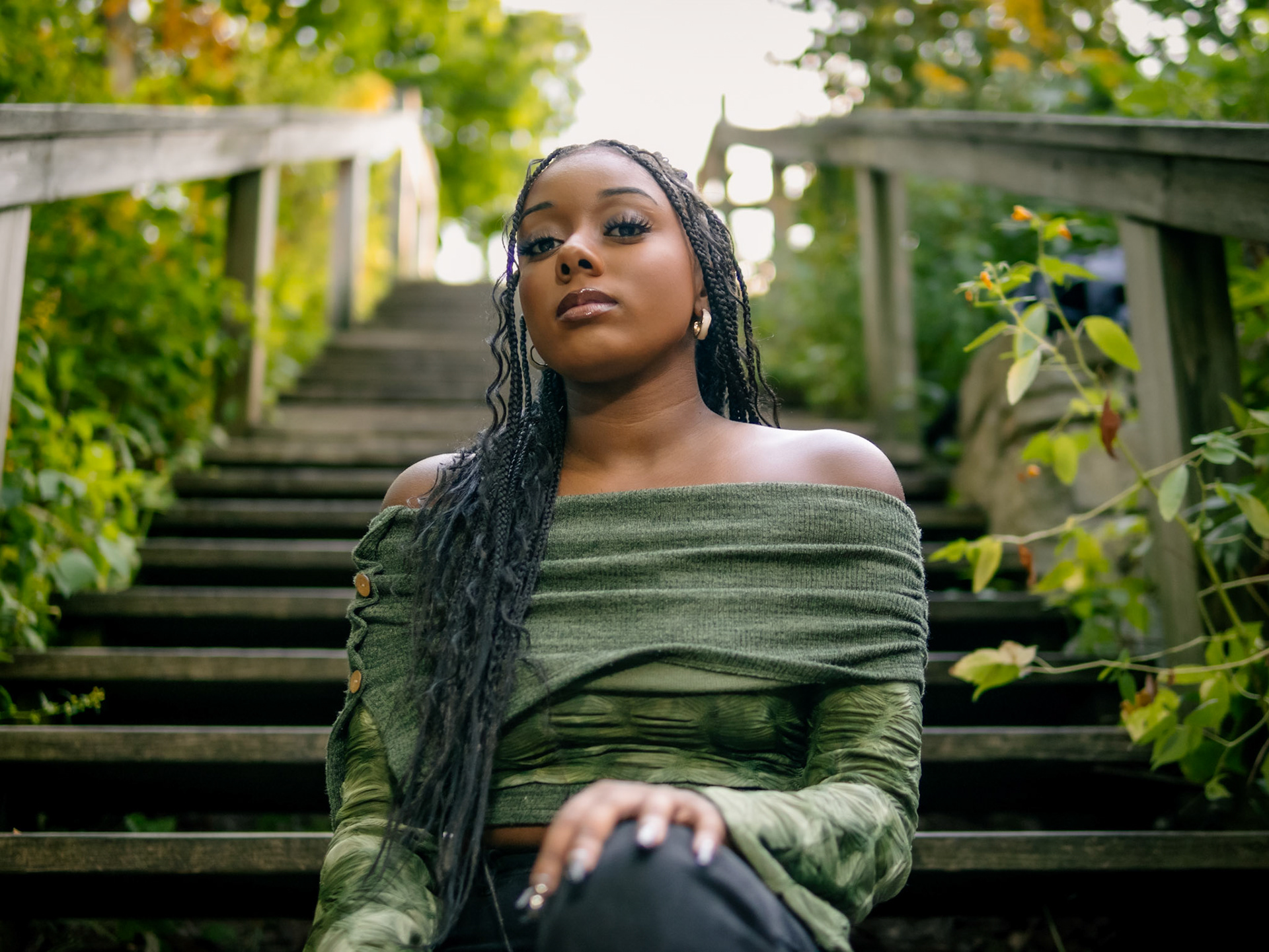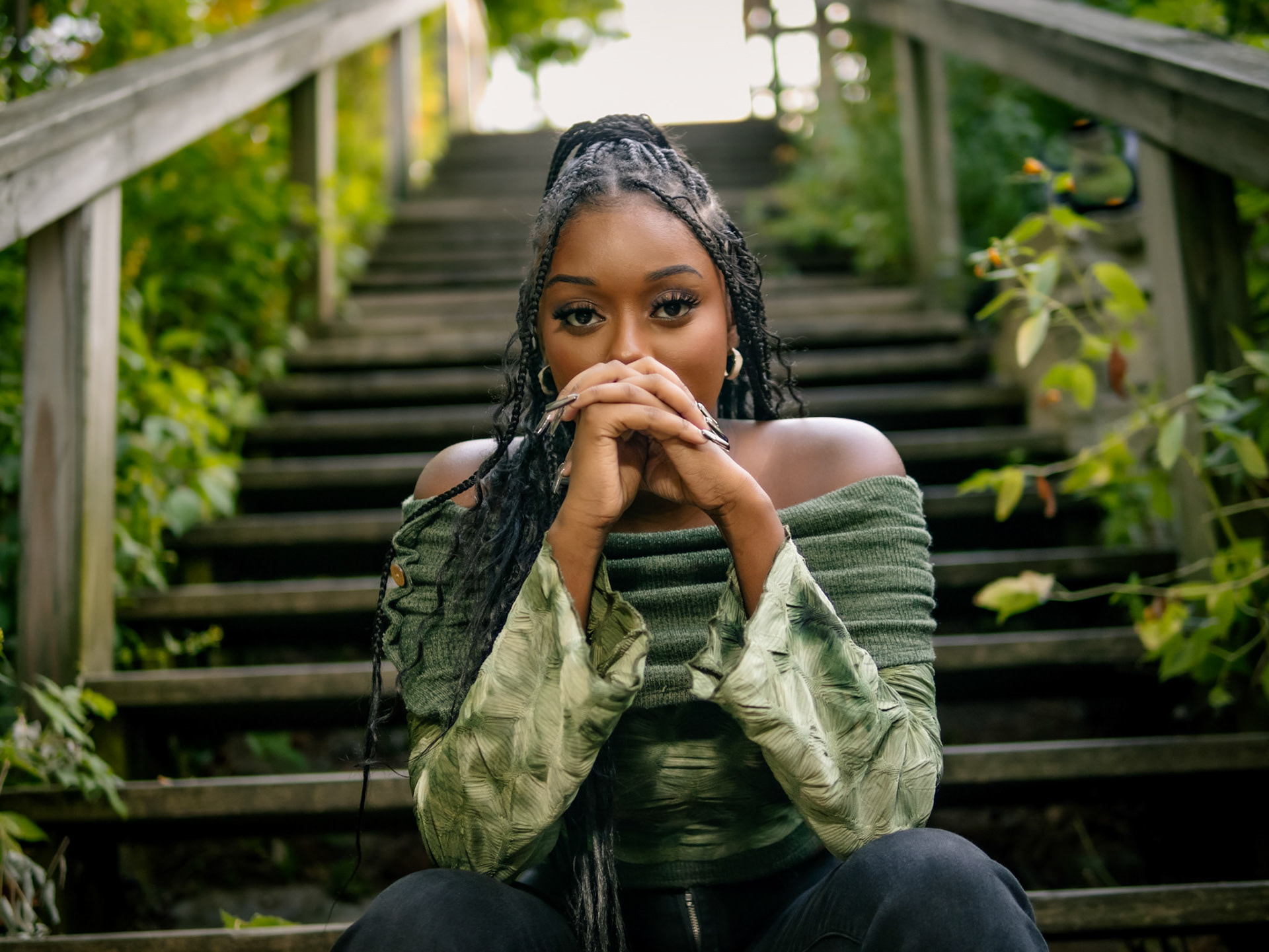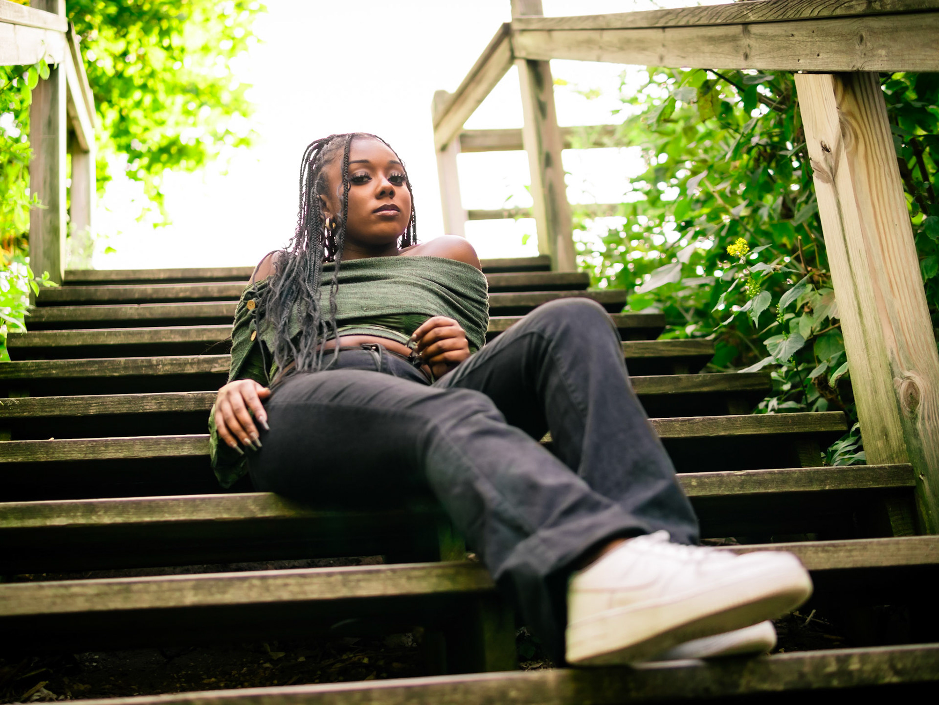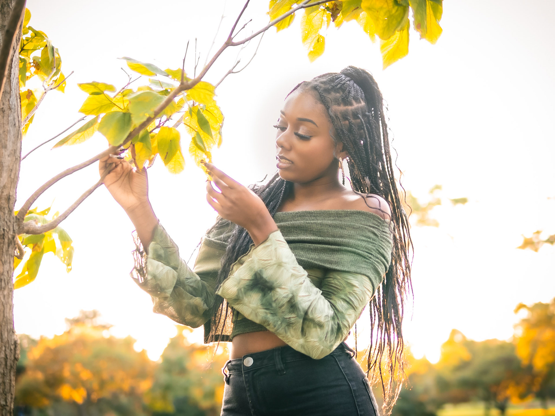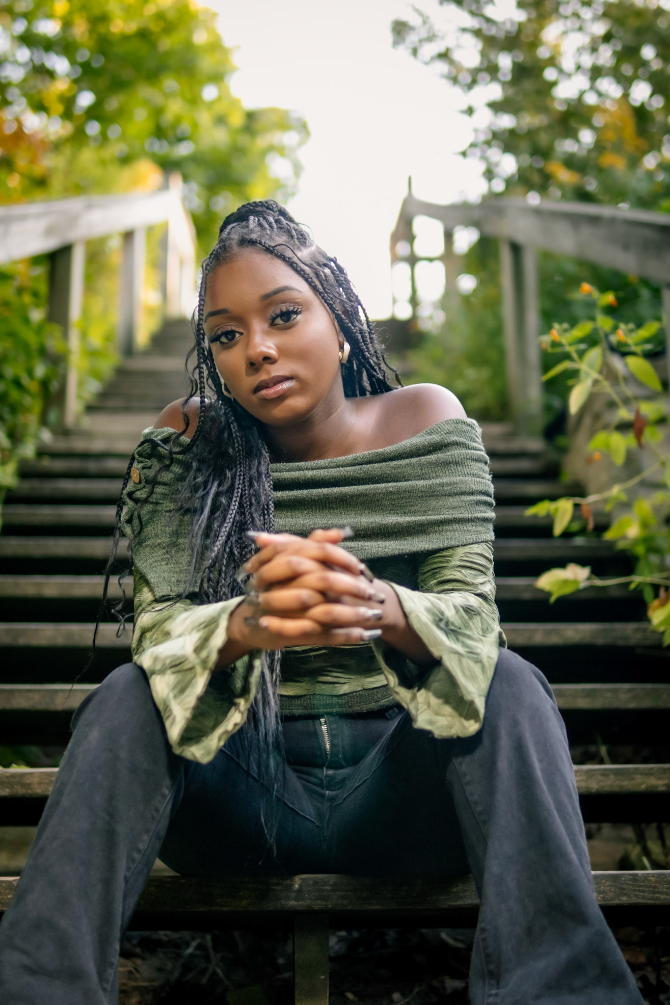 A refreshing nature photoshoot, perfectly blending a vibrant green-themed outfit with the beauty of the outdoors.